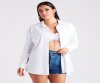 This adorable button-down top is a must-have for a beachside vacay. It features a collared neckline, long sleeves with buttons to cuff, a complete button-down front, and a relaxed fit. Style with the matching bra top and distressed denim shorts for a casual summer vibe.
