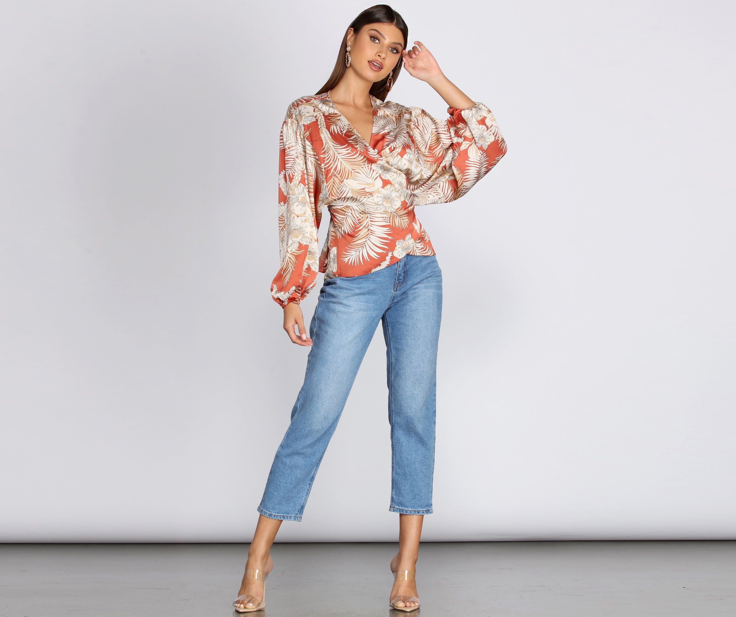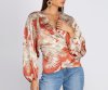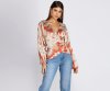 Cinch up your look with this flattering belted blouse! It features a wrap front creating a V neckline, long billowy sleeves with elastic banded cuffs, and a chic tie at the back. Top is composed of a floral printed lightweight woven fabric with no stretch.