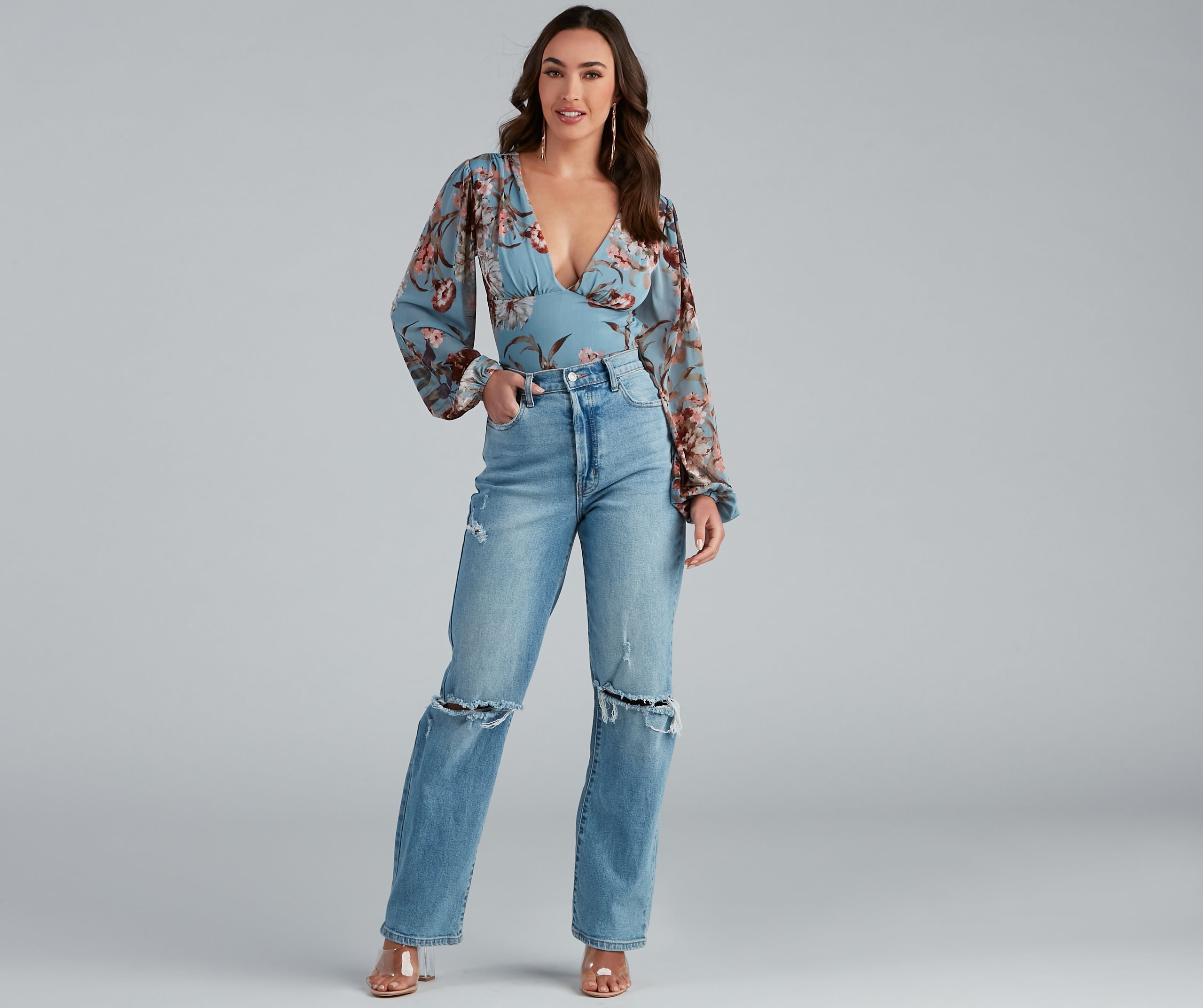 A blooming bodysuit is what you need to stay on-trend, babe! This gorgeous bodysuit features a pretty floral print, plunging V-neckline, long sleeves, and a sexy lace-up back design. The bodysuit is composed of a mesh fabric that offers a form hugging fit with a moderate stretch. Complete look with
