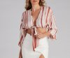 Layer on this breezy lightweight top for an effortless everyday look. It features three-quarter length flowy sleeves, a tie-front design creating a V-neckline, and a cropped fit. The woven gauze fabric features a pretty all-over striped print. Style this top with a