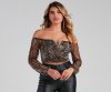 Bring the sass in this edgy-chic cropped blouse. It features a sultry off-the-shoulder design with a notched front neckline, long sheer bishop sleeves, a wrap-front, and a cropped, form-hugging fit. The sheer mesh fabric has an all-over snake print pattern and includes a front knit lining. Style this top with