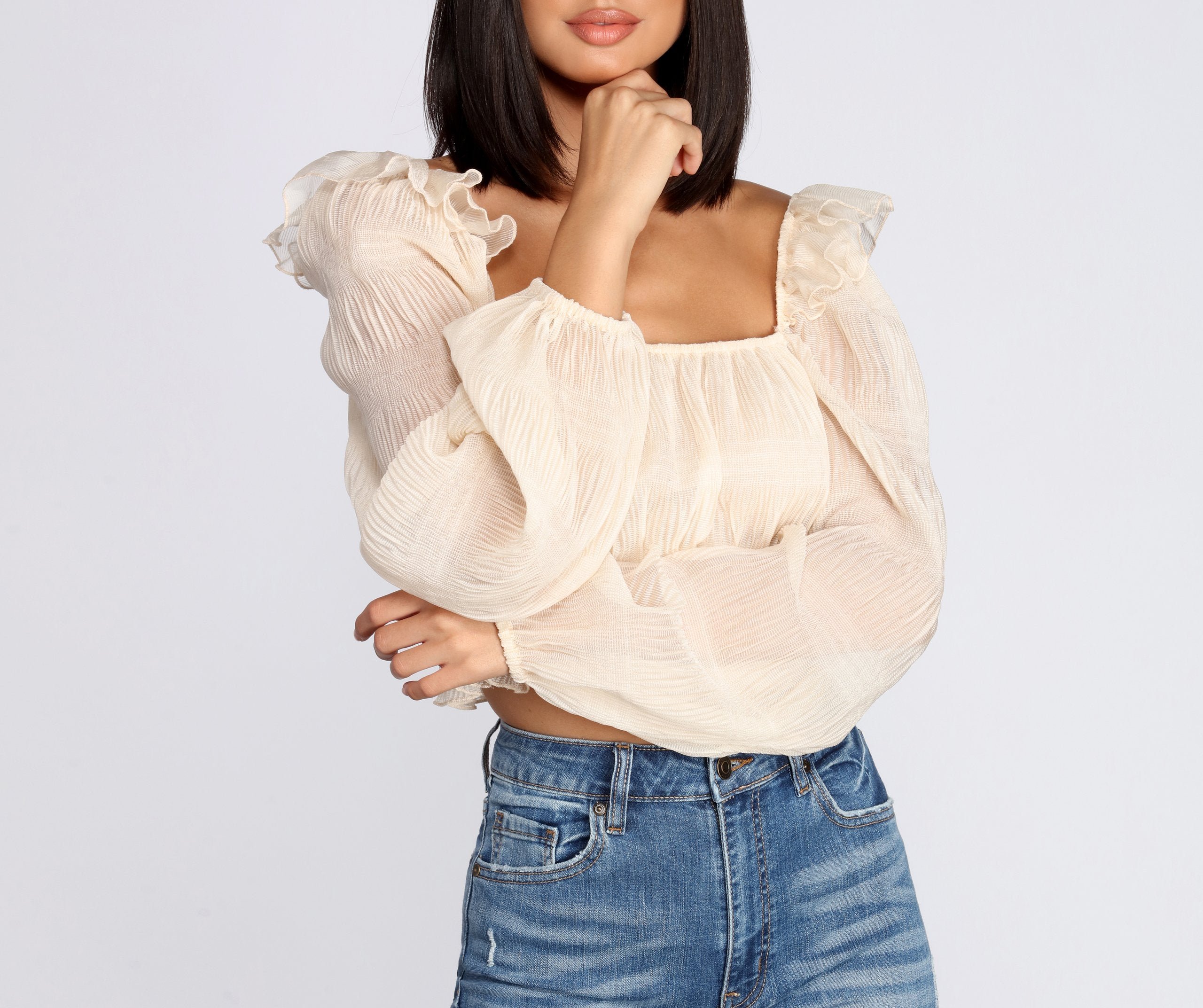 Get an effortlessly pretty look with this lightweight and airy blouse. It features long balloon sleeves with elastic cuffs, a square neck with ruffle detailing along the shoulders, and an elastic banded ruffle mid-length hem. Top is composed of a sheer crinkle detail sheer woven fabric with no stretch.