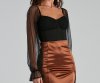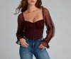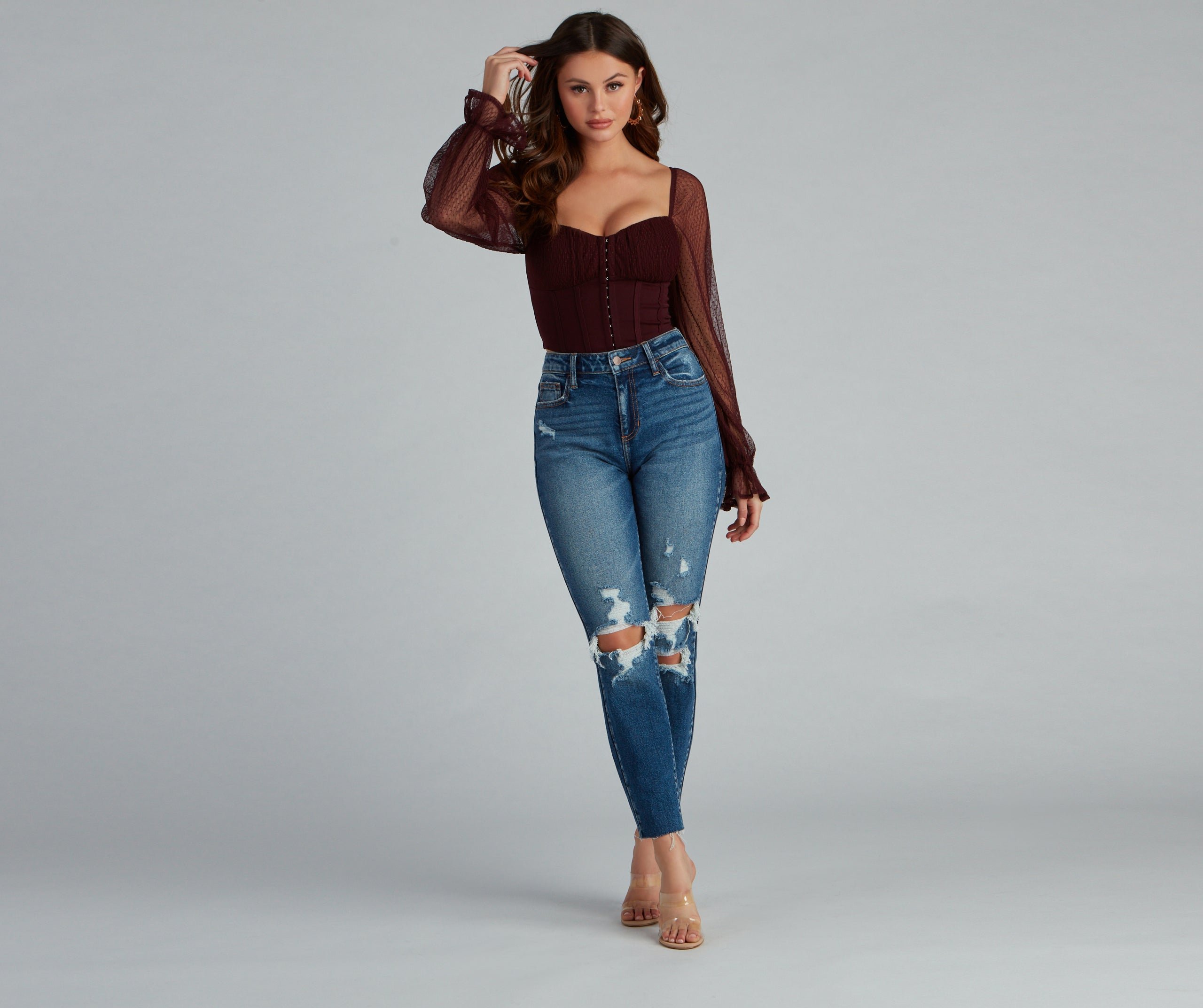 The cutest trend is here in this bustier top! It features mesh dot ruffled long sleeves and a sweetheart neckline with hook-eye closures on a corset-style bodice. The top is composed of Ponte knit fabric with a moderate stretch. Complete the look in high-rise