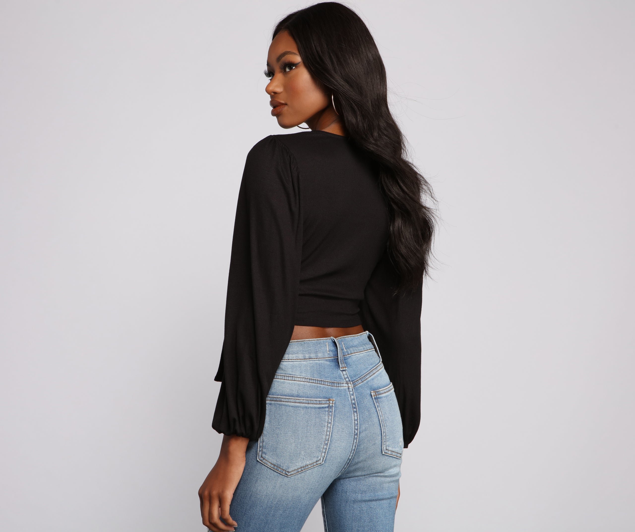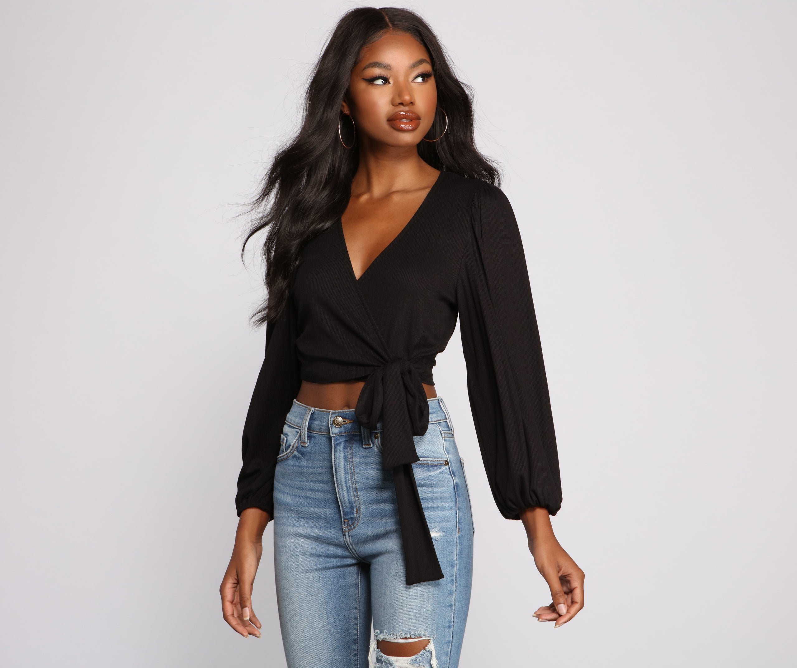 Showcase your effortlessly chic style in this adorable crop top! It features long bishop sleeves with a wrap tie front detail. Pair this top with