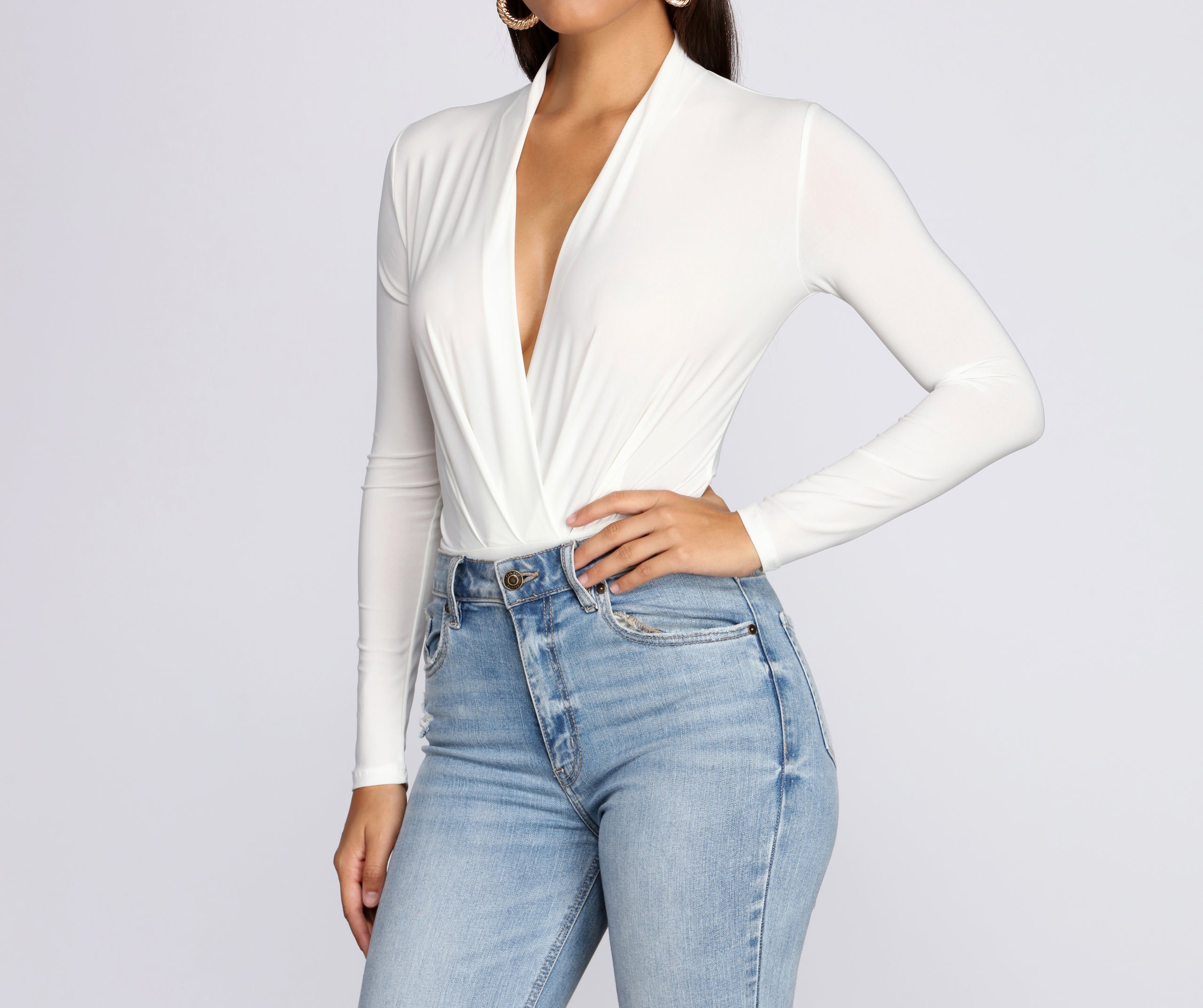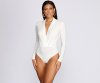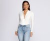 Nothing will beat this flattering cute bodysuit! It features long fitted sleeves, a plunging V neckline created by a wrap front at the waist, pleated detailing, and a thong bottom with snap button closures. The bodysuit is composed of a smooth knit fabric with plenty of stretch.