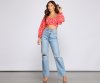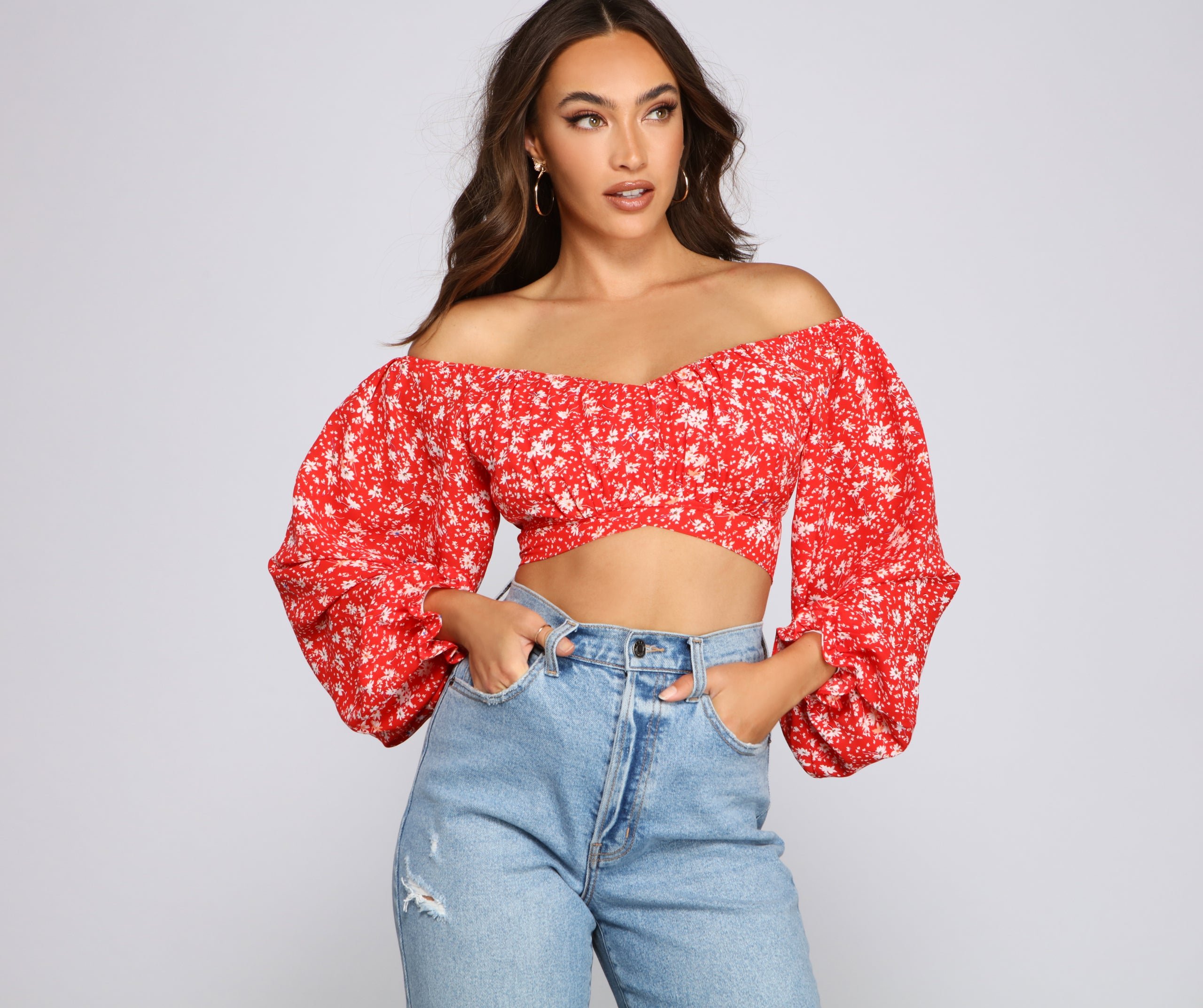 Keep it pretty fab with a crop top that brings the charm! The top features an off-the-shoulder neckline with a sweetheart bust, long sleeves, a ditsy floral print, and a cropped hem with tie-back ties. Complete look with