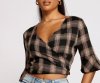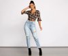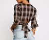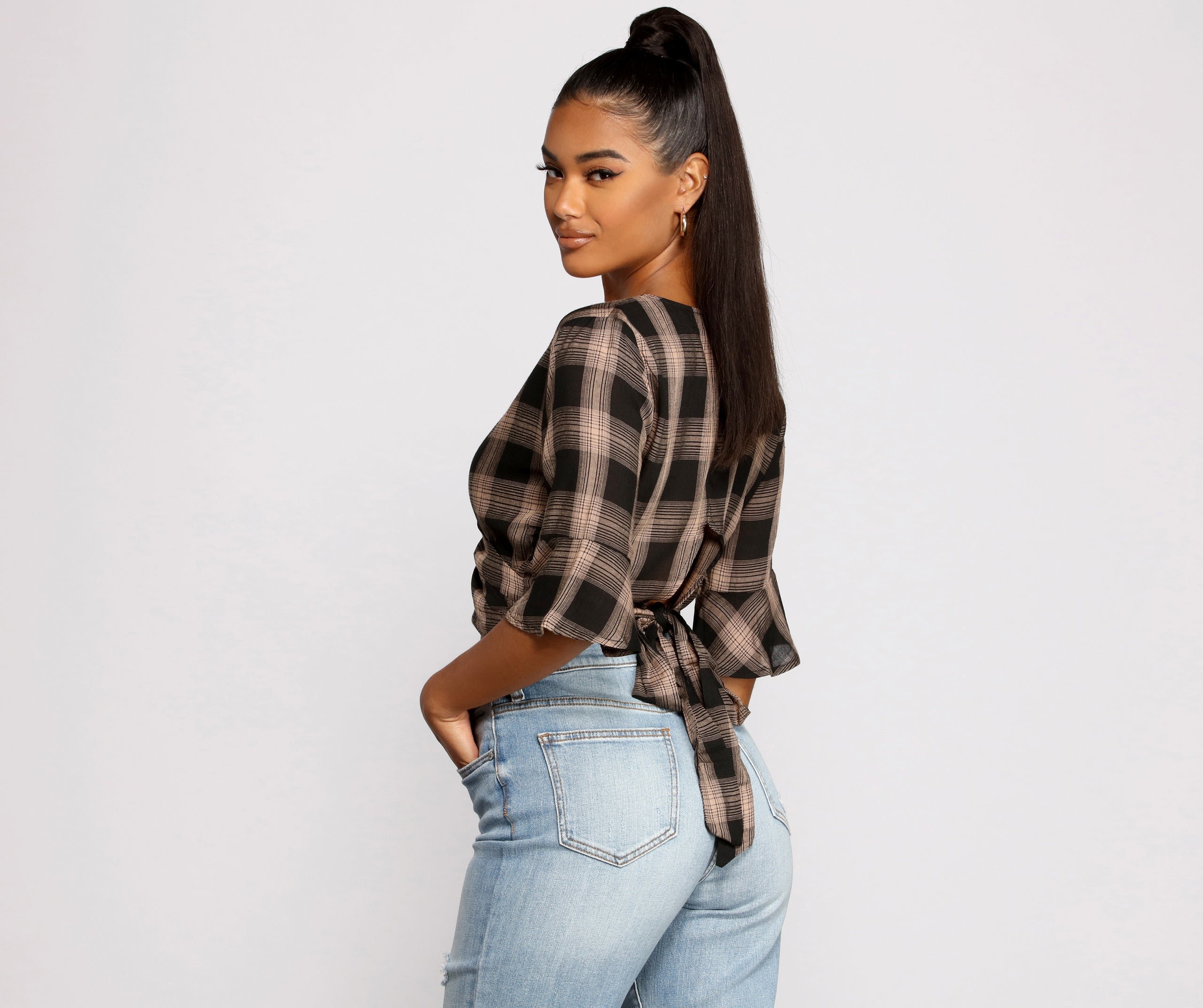 Keep it pretty and chic in a plaid crop top! The top features a plunging wrap V-neckline, quarter-length flutter sleeves, a chic plaid print, and a lower back keyhole with back ties. Complete look with