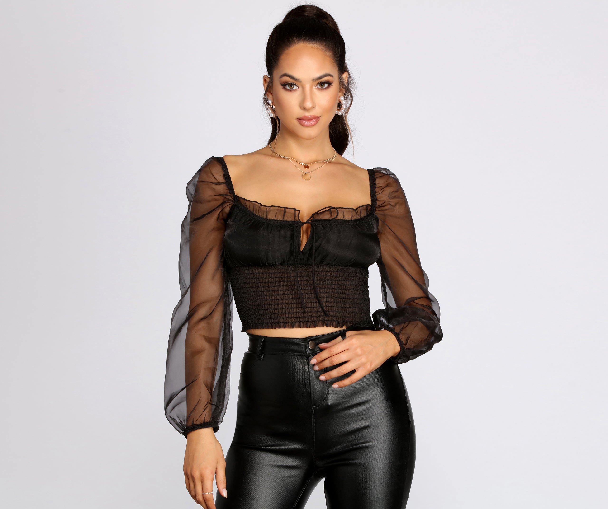 Stay chic and stylish in this sheer smocked crop top that will be the statement of your 'fit!