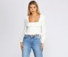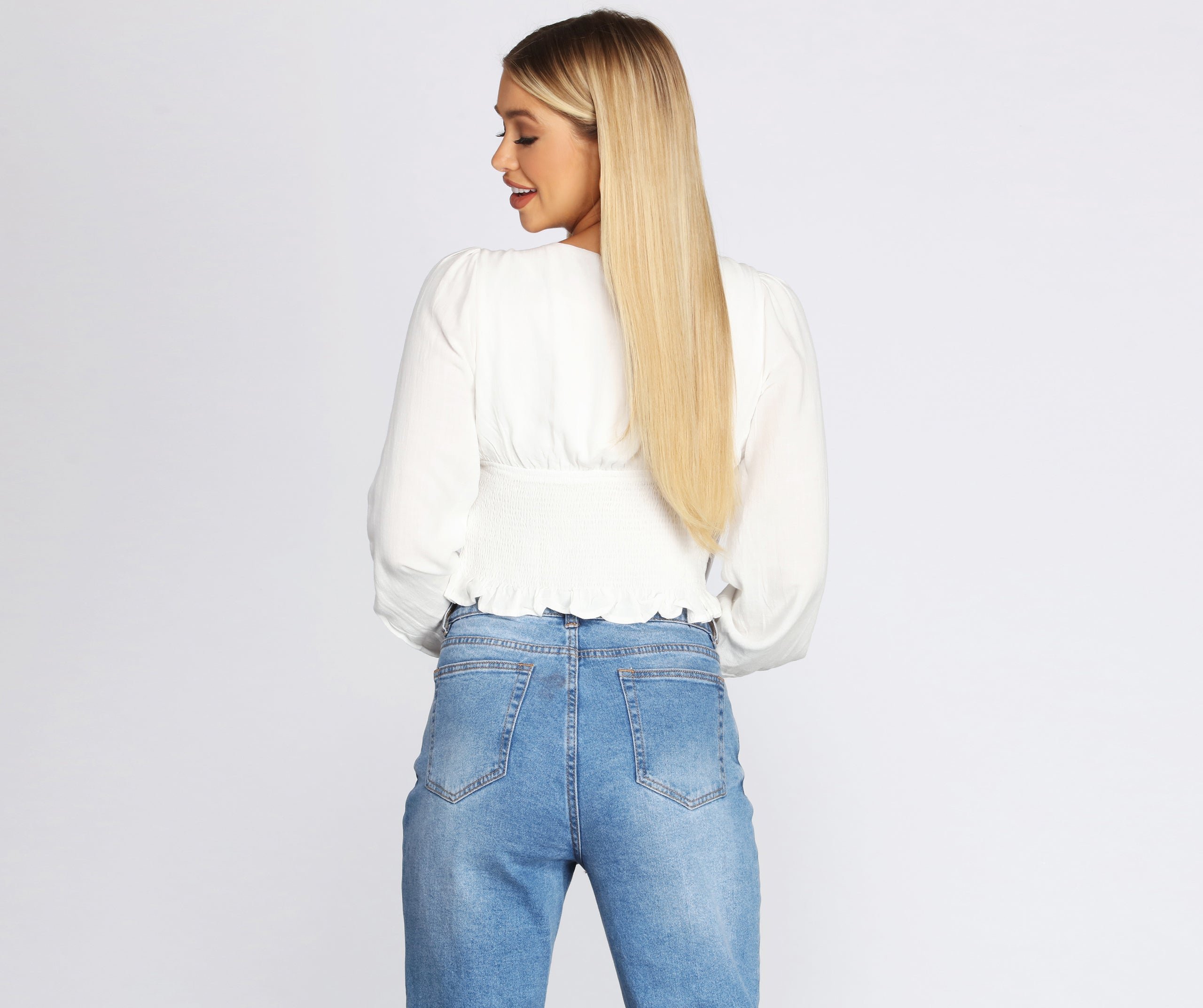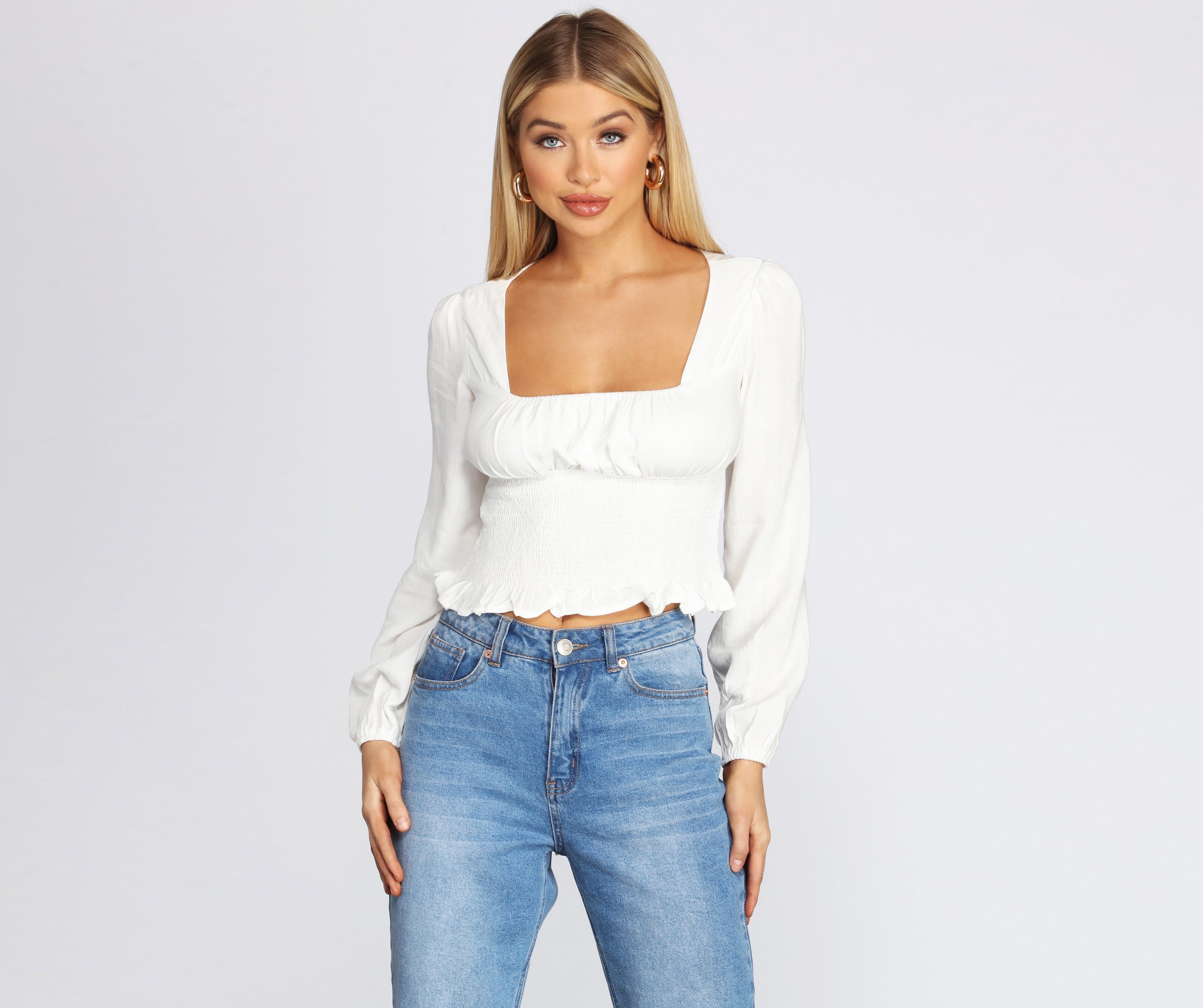 The smocked waist of this chic blouse gives it a total trendy factor. It features long sleeves with elastic banded cuffs, a square neck, slight pleated detailing, a stretchy smocked waist, and a cropped hem with a ruffle trim. The top is composed of a cotton blend fabric.