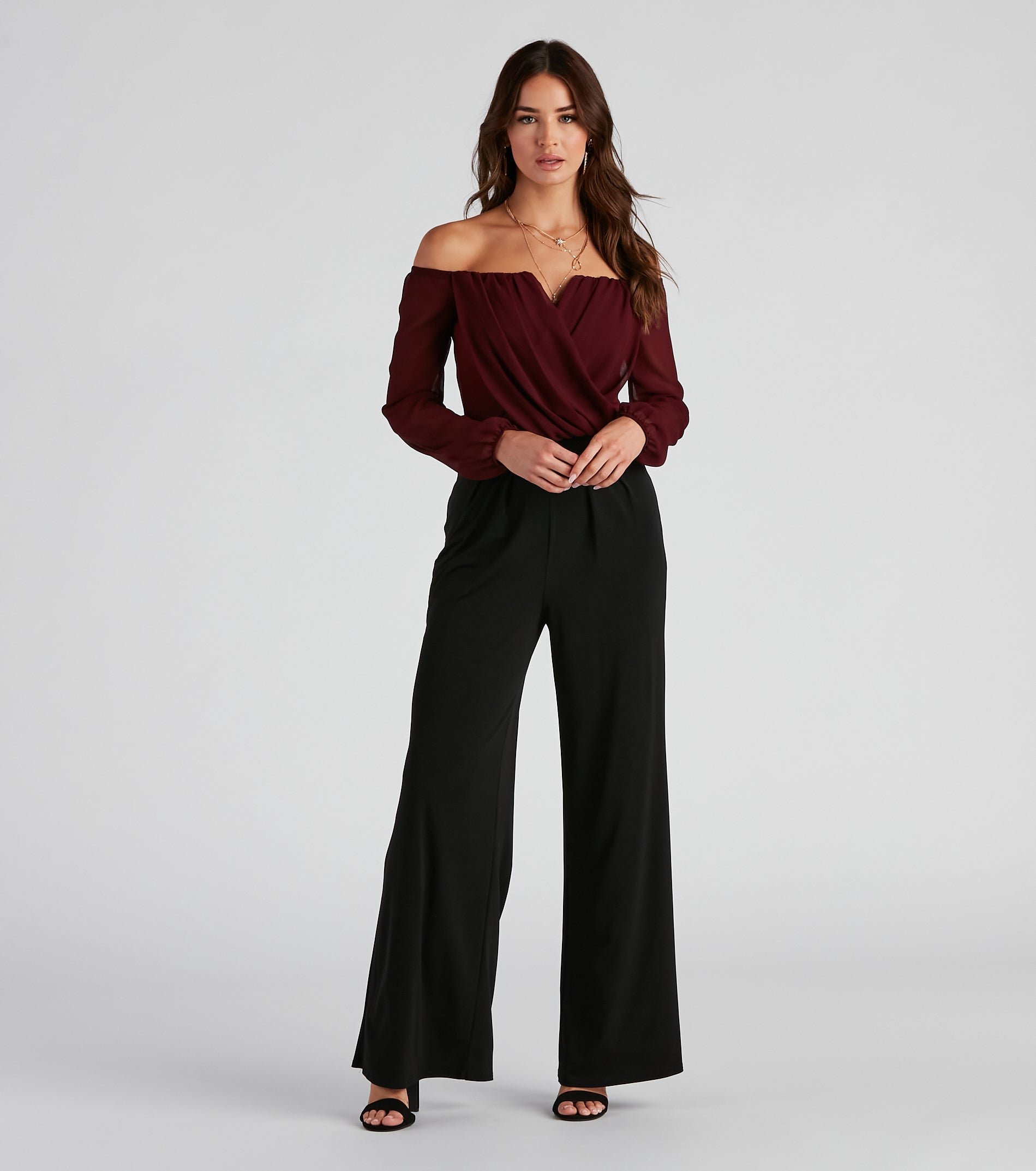 Keep it sophisticated in a chiffon top that is perfect for creating a trendy workwear look?or a night out with friends.?This chiffon top features a charming off-the-shoulder neckline, a wired V-shaped bust, and pleated details. The top is composed of airy chiffon fabric and is lined with a stretchy crepe fabric. Style with