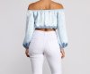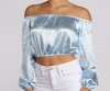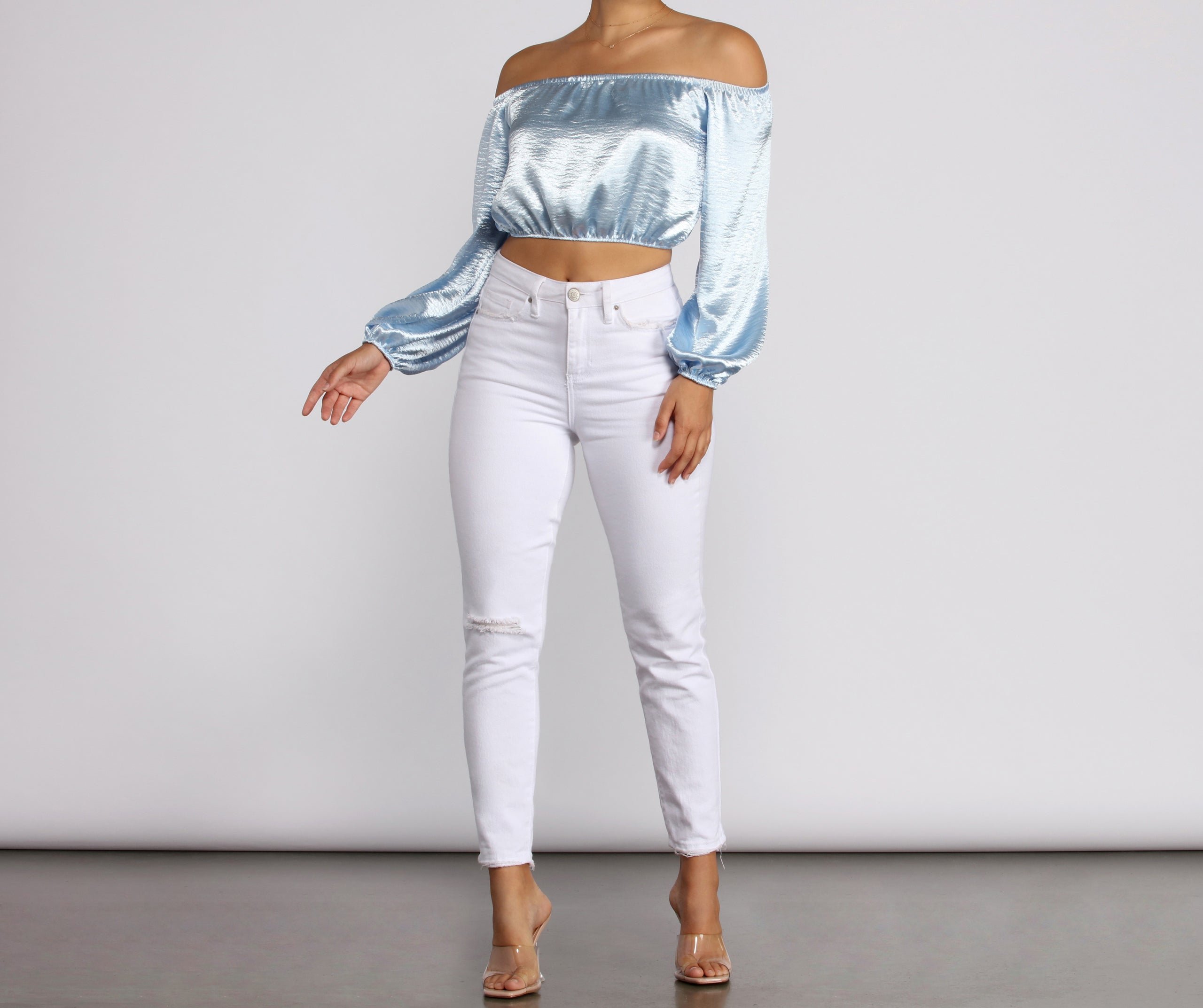 Bring the sophistication and stun them all in this mesmerizing top! It features an elastic off the shoulder neckline, long flowy sleeves and a cropped hem. Top is composed of a satin-like fabric that offers a relaxed fit with a minimal stretch.