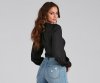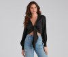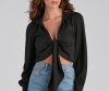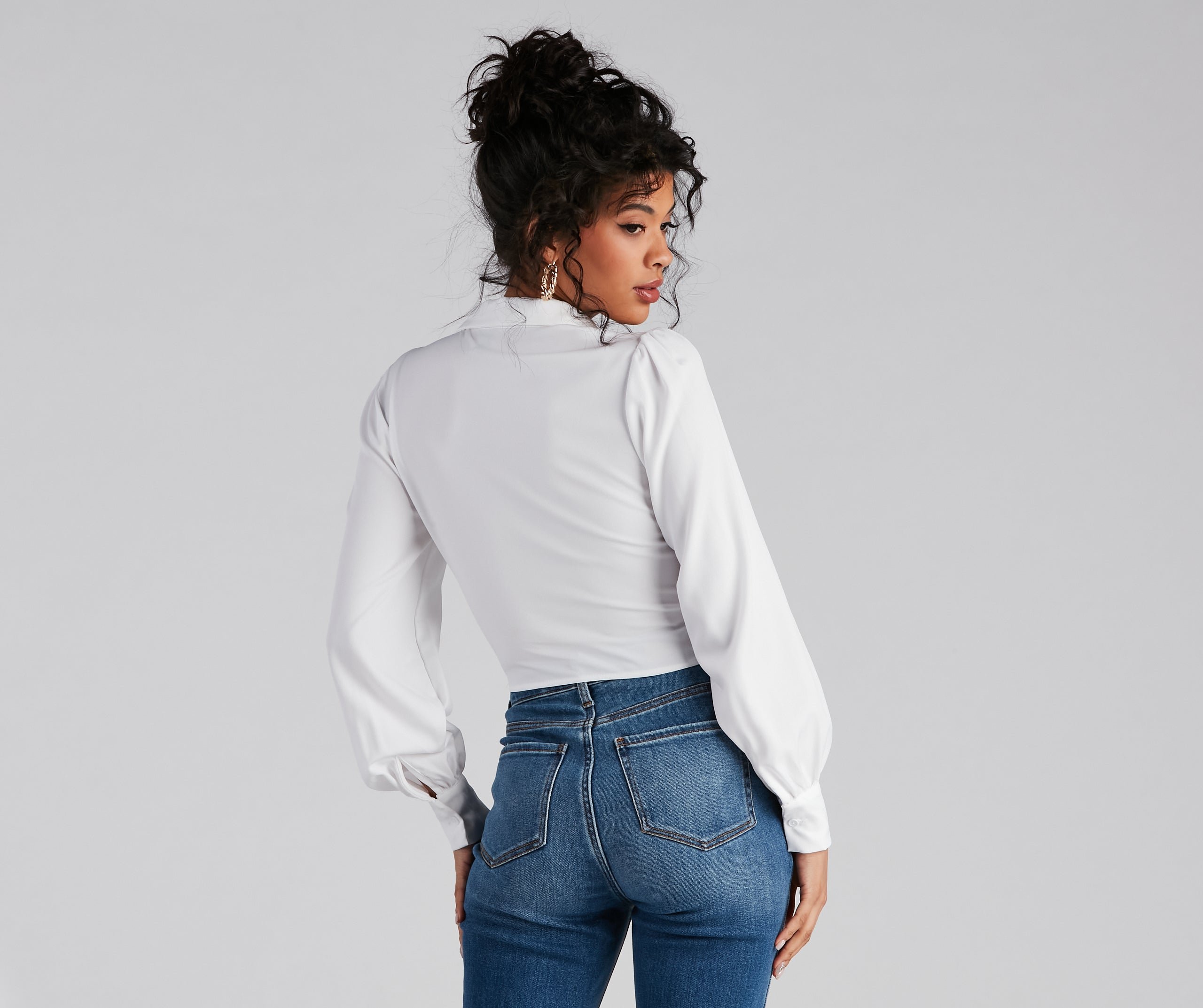 It's the sultry appeal. This tie-front collared top is perfect for dressing up your jeans. It features long bishop sleeves with button cuffs, a plunge V-neckline, and a cropped hem. Complete the look with a chic