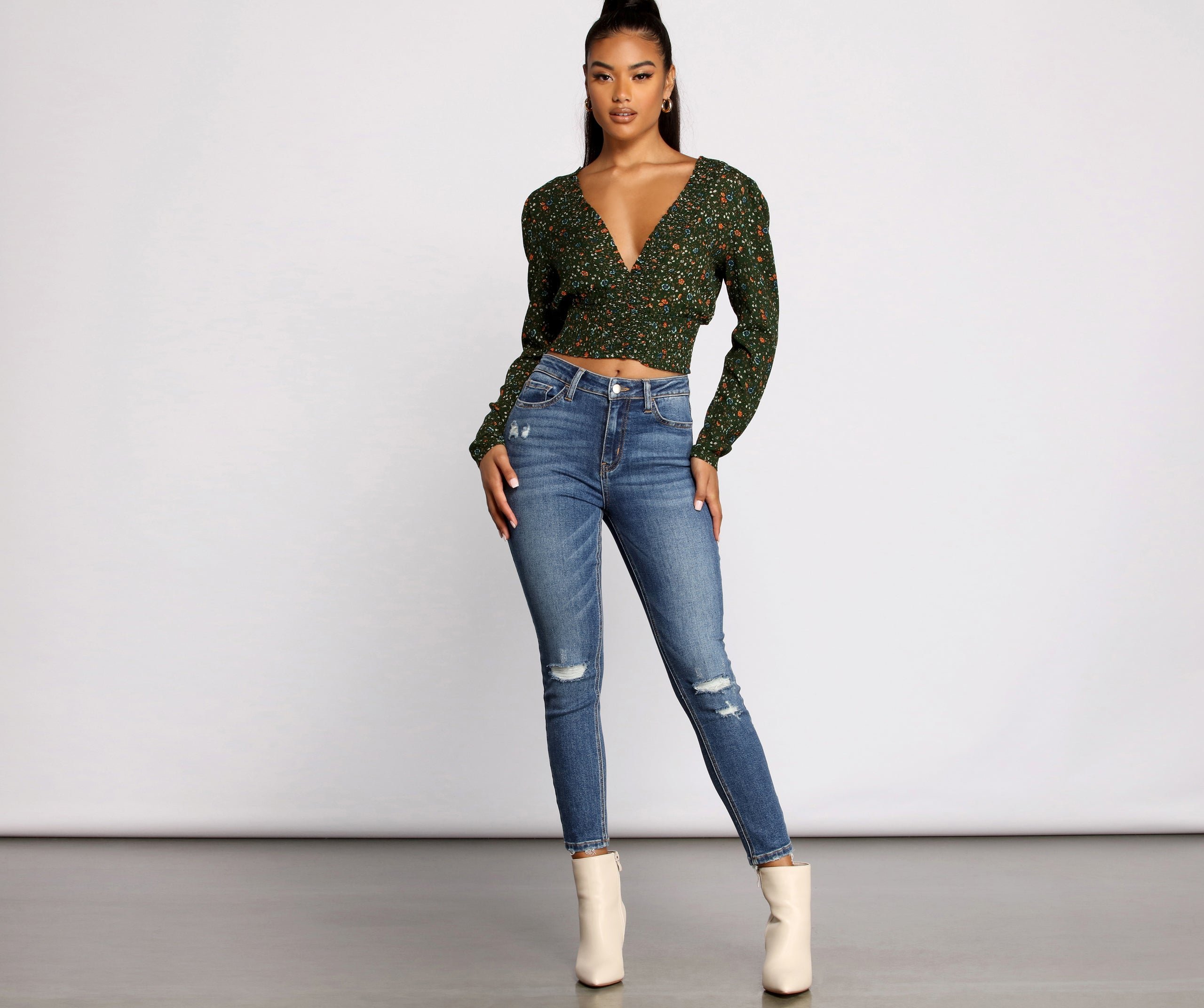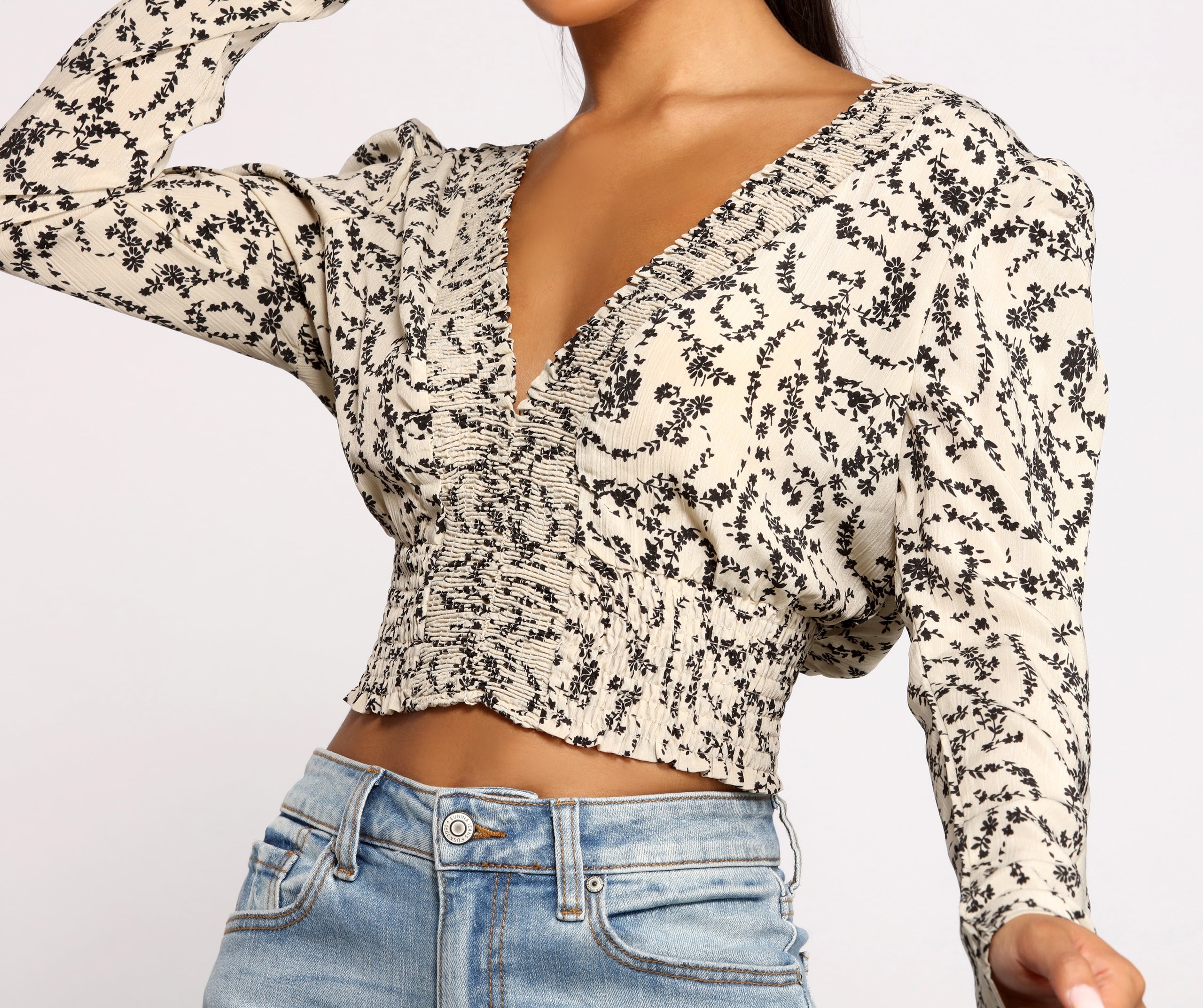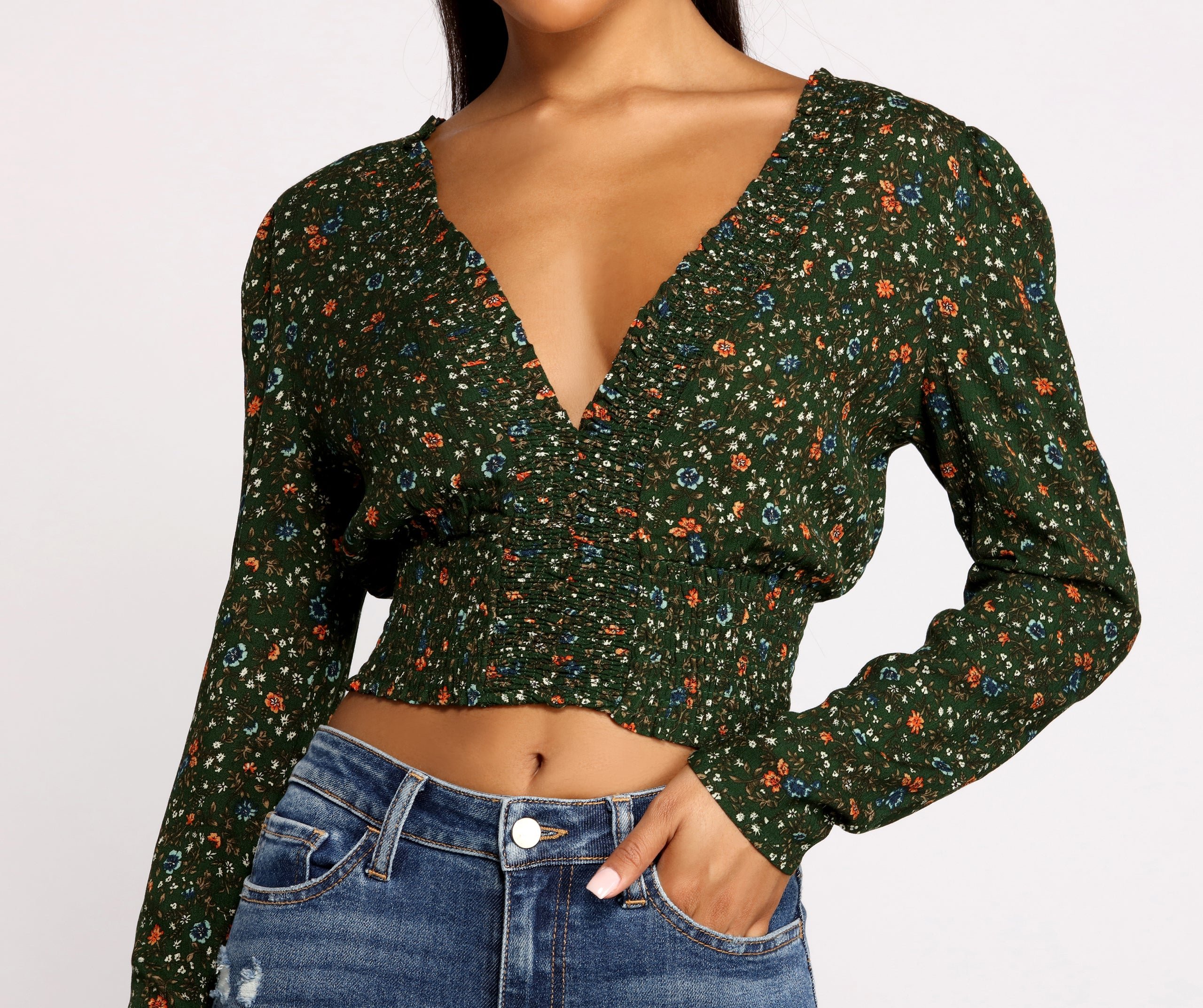 Show off your sweet side in a floral crop top that brings the charm. The crop top features a plunging V-neckline, a partially smocked bodice, and a pretty floral print. Complete your look with