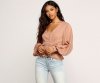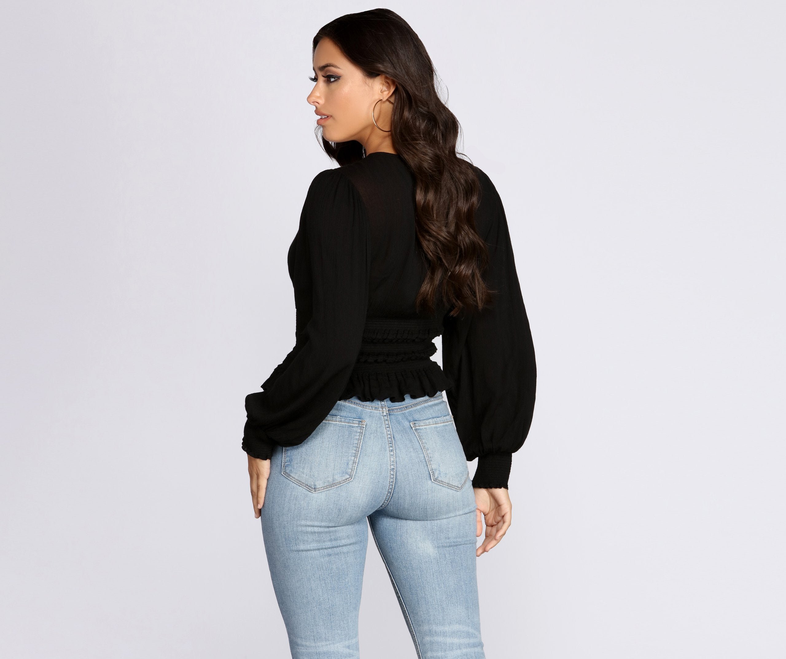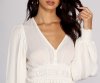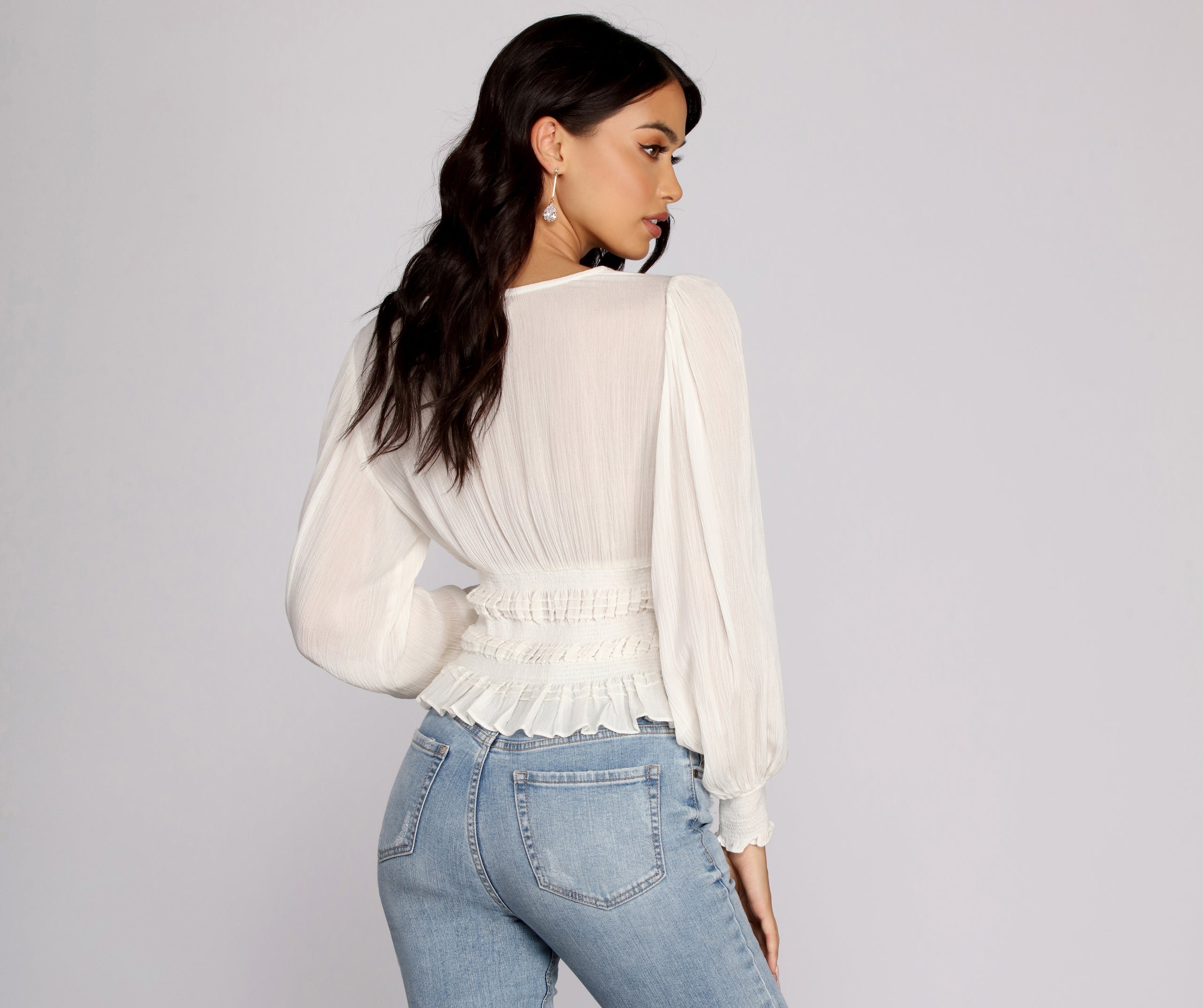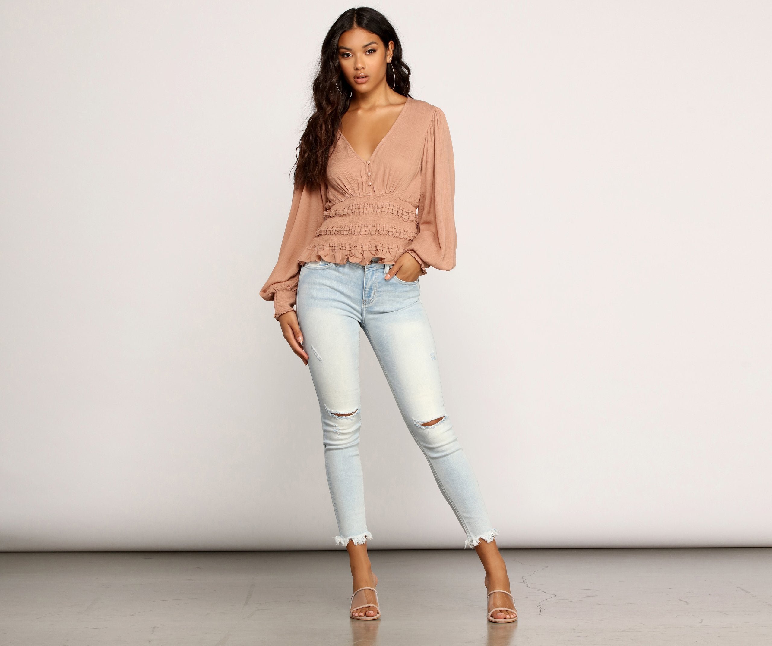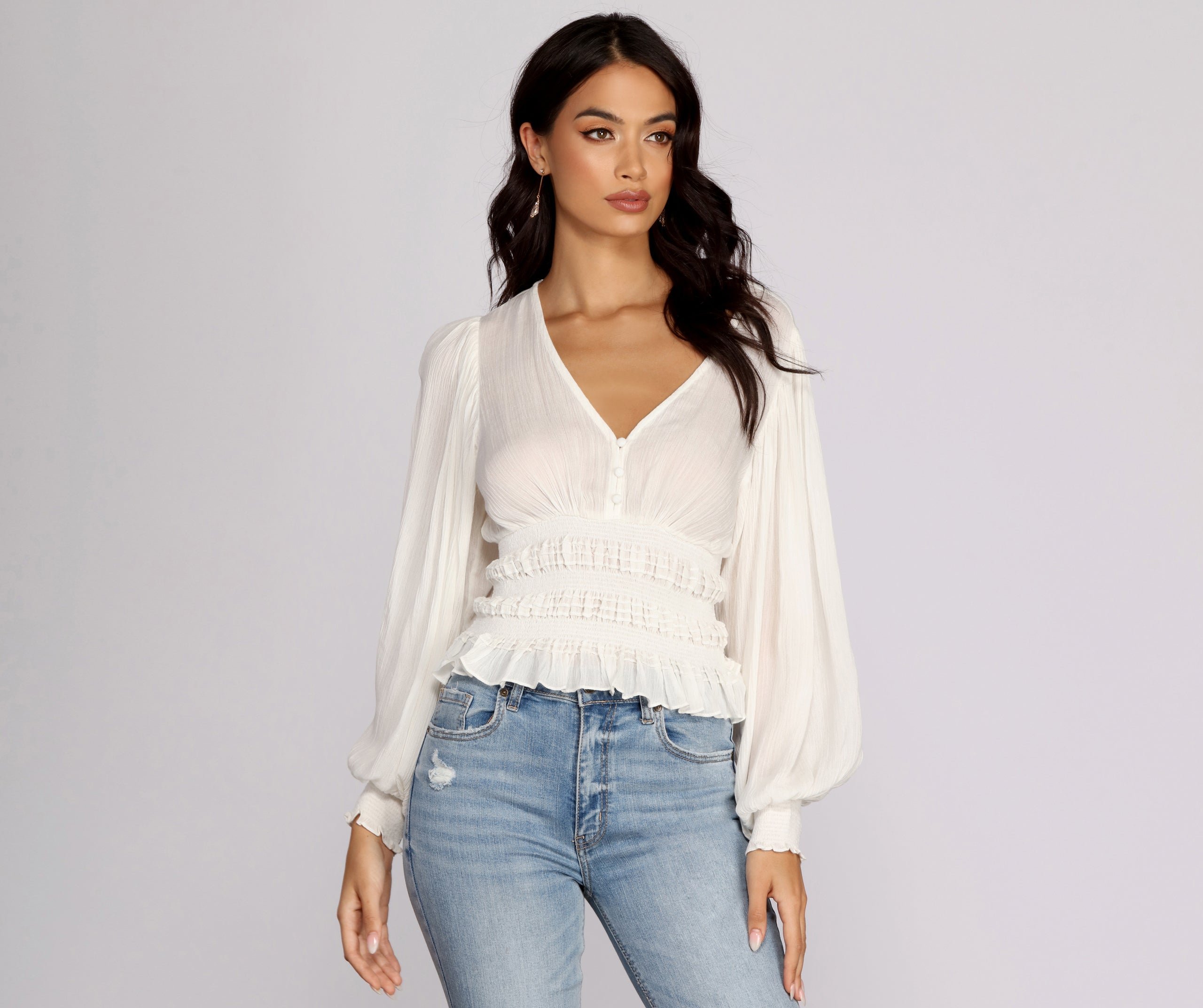Breezy and effortlessly chic, this blouse is made for easy, warm-weather getaways. Top features long, billowy sleeves with smocked cuffs, a plunging V leading to a three-button closure, and a smocked and ruffle-trimmed elasticized waist. Blouse is made from a gauzy, pure rayon with little to no stretch.