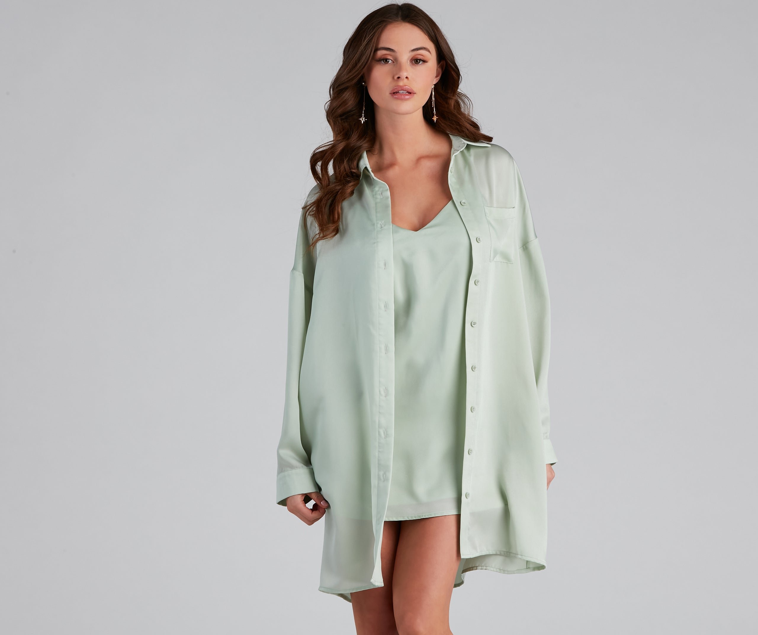 Keep it chic this weekend in this satin tunic for a classy night out! It features long sleeves with button cuffs, a collared neckline, one pocket, button-front closure, and a relaxed scoop hem. Complete the look in the matching slip dress.?