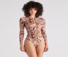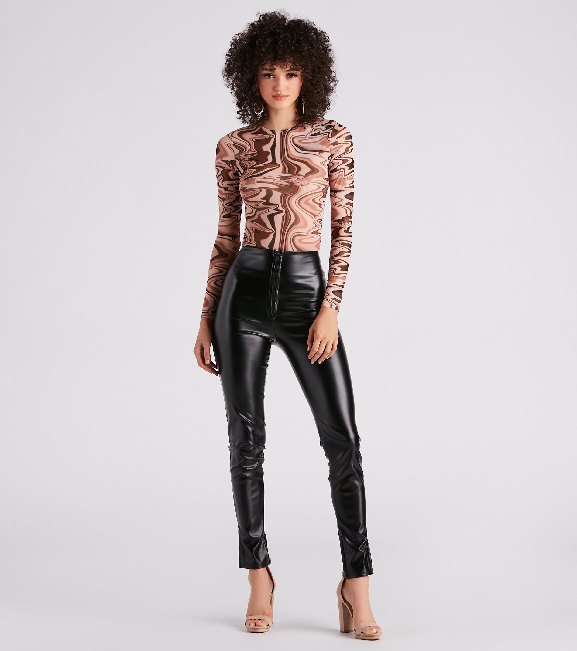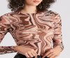 Look and feel like a groovy babe styling this sheer mesh print bodysuit with your favorite bottoms! It features fitted long sleeves, a crew neck, and a 70s-inspired swirl print. Complete the look in sleek