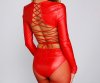 Lace-up in a bold bodysuit that brings the fire to your look! The bodysuit features a crew neckline, long sleeves, a sexy lace-up back, and a full coverage bottom with a dual snap button closure. The bodysuit is composed of a form-hugging latex fabric that offers a slight stretch. Complete look with
