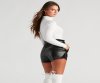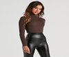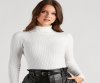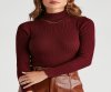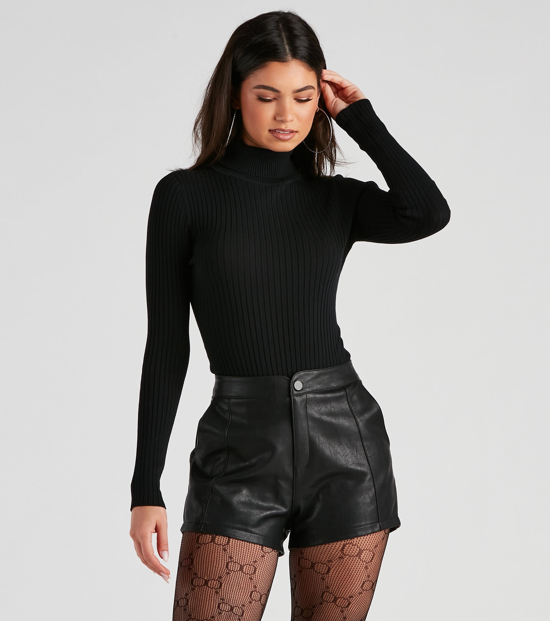This ribbed knit bodysuit is a classic staple for the winter season. It features a turtleneck with a fold-over design, long sleeves, a thong bottom, and a form-hugging fit. Style this bodysuit with high-rise jeans and