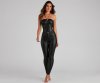 Channel an edgy glam look with a halter that makes a bold impression! The bodysuit features a halter neck, a chunk chain-link halter strap, and a thong bottom with dual snap-button closure. The bodysuit is composed of a lined faux leather fabric that offers a form hugging fit with a moderate stretch. Complete look with