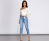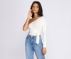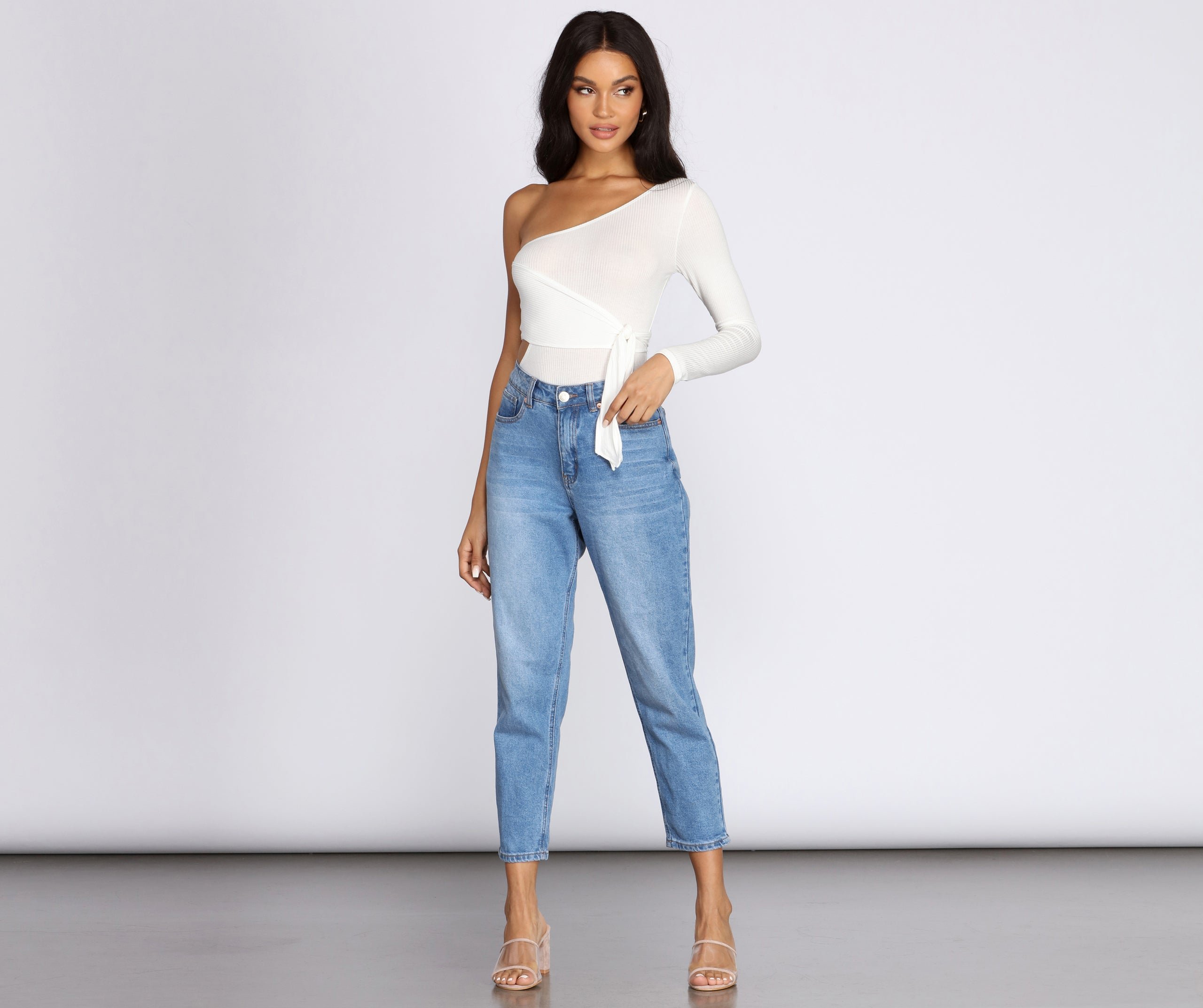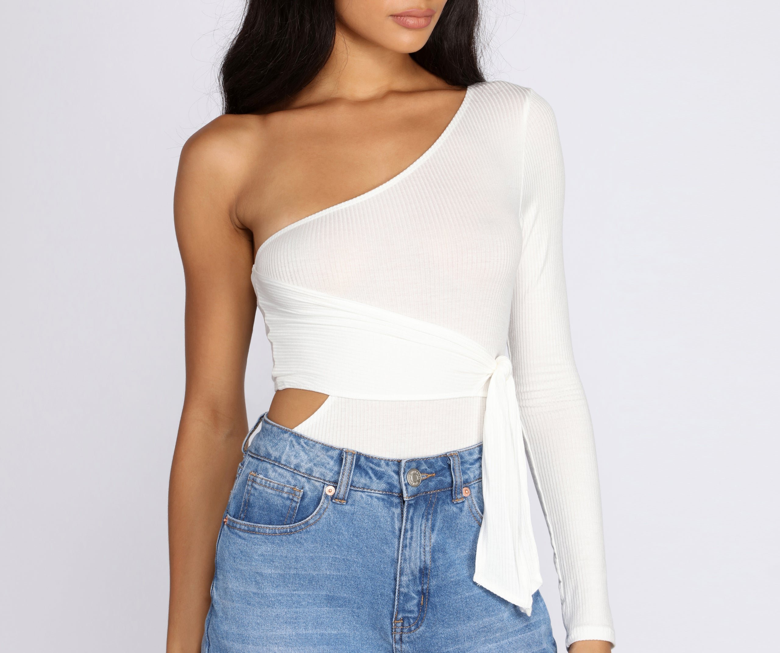 You're a total it girl, so be the head of your squad in this trendy knit bodysuit! It features a one shoulder neckline with a long fitted sleeve, a high waist seam with a side cut out and tie front, and a thong bottom with snap button closures. The ribbed knit bodysuit offers plenty of form-fitting stretch.