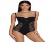 Shape your curves in the sexiest way possible! This black lace shaper bodysuit features a deep scoop front with a sheer lace trim, adjustable shoulder straps, lace insets on the side with a contrast nude lining, and a seamless full coverage bottom with snap button closures. Bra is not included.?