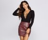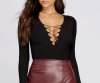 Falling for a bodysuit with all the right features! Long sleeves, a deep V neckline, and a form fitting silhouette. Bodysuit also features a lace up design down the center that gives off a flattering finish! Composed of a knit fabric with plenty of stretch.