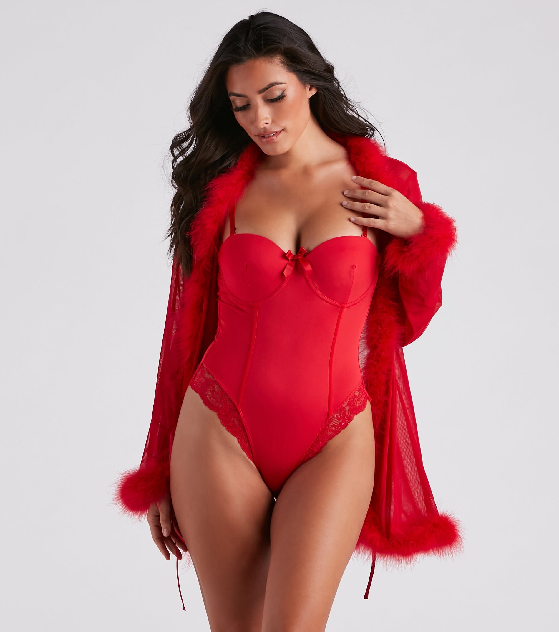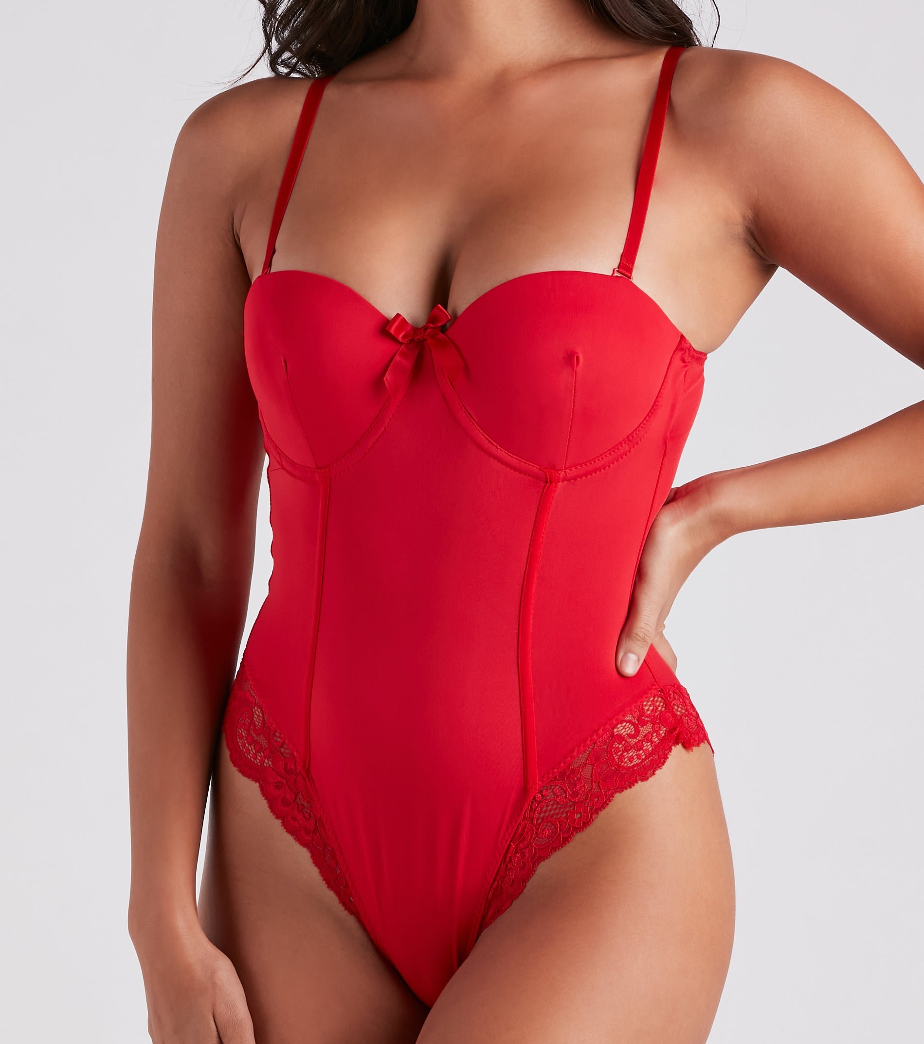 They'll be lovestruck by your stunning looks in this adorable lace teddy bodysuit! It features a sweetheart neckline, a bra top with underwire cups and a center ribbon bow accent, adjustable spaghetti straps, a cheeky fit with dainty sheer lace trim, and a form-hugging silhouette. Style with a sexy sheer robe.
