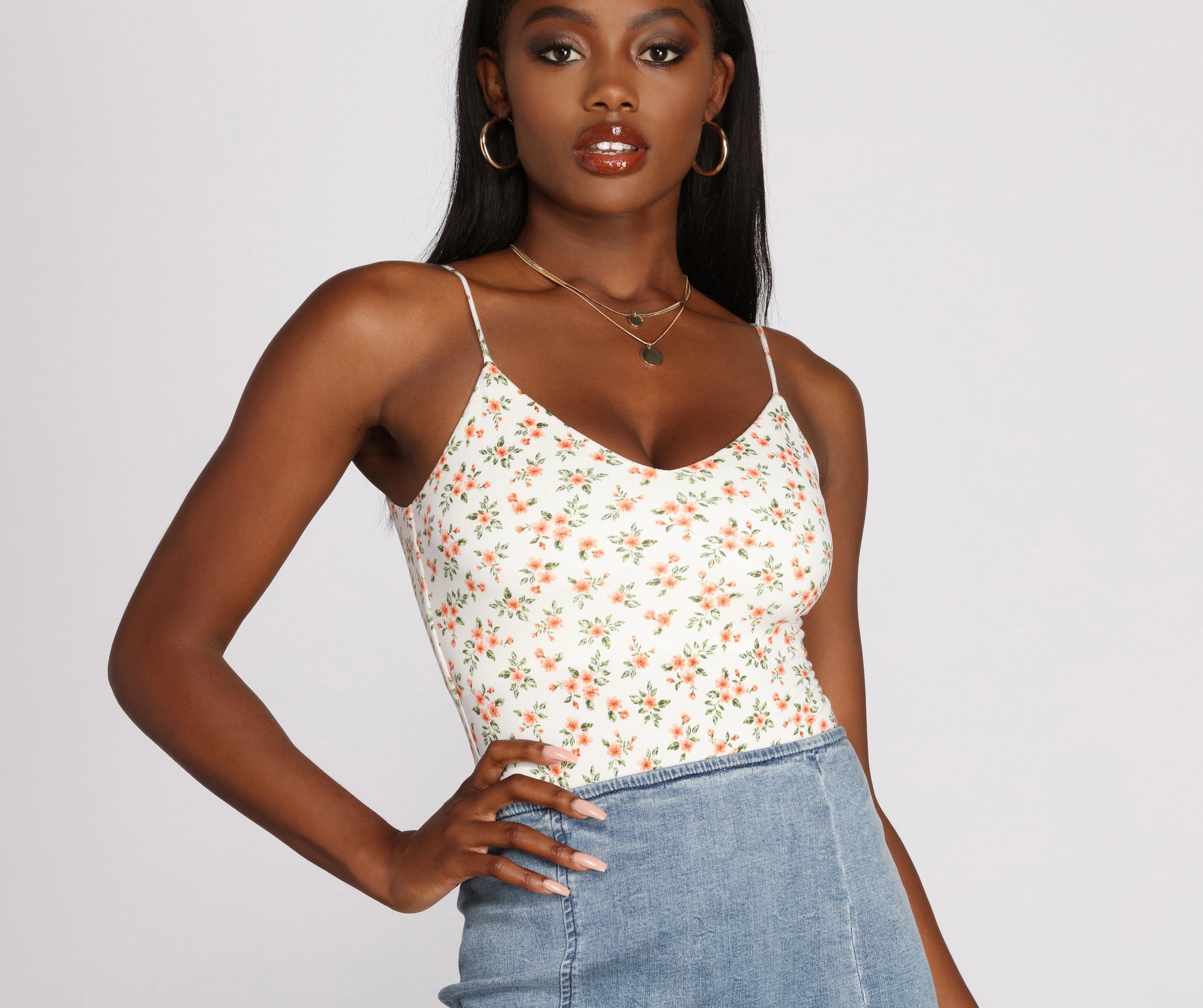 Doll, you'll look oh so darling in this adorable ditsy floral bodysuit! Its soft and stretchy knit fabric will offer a comfortable, form hugging fit.