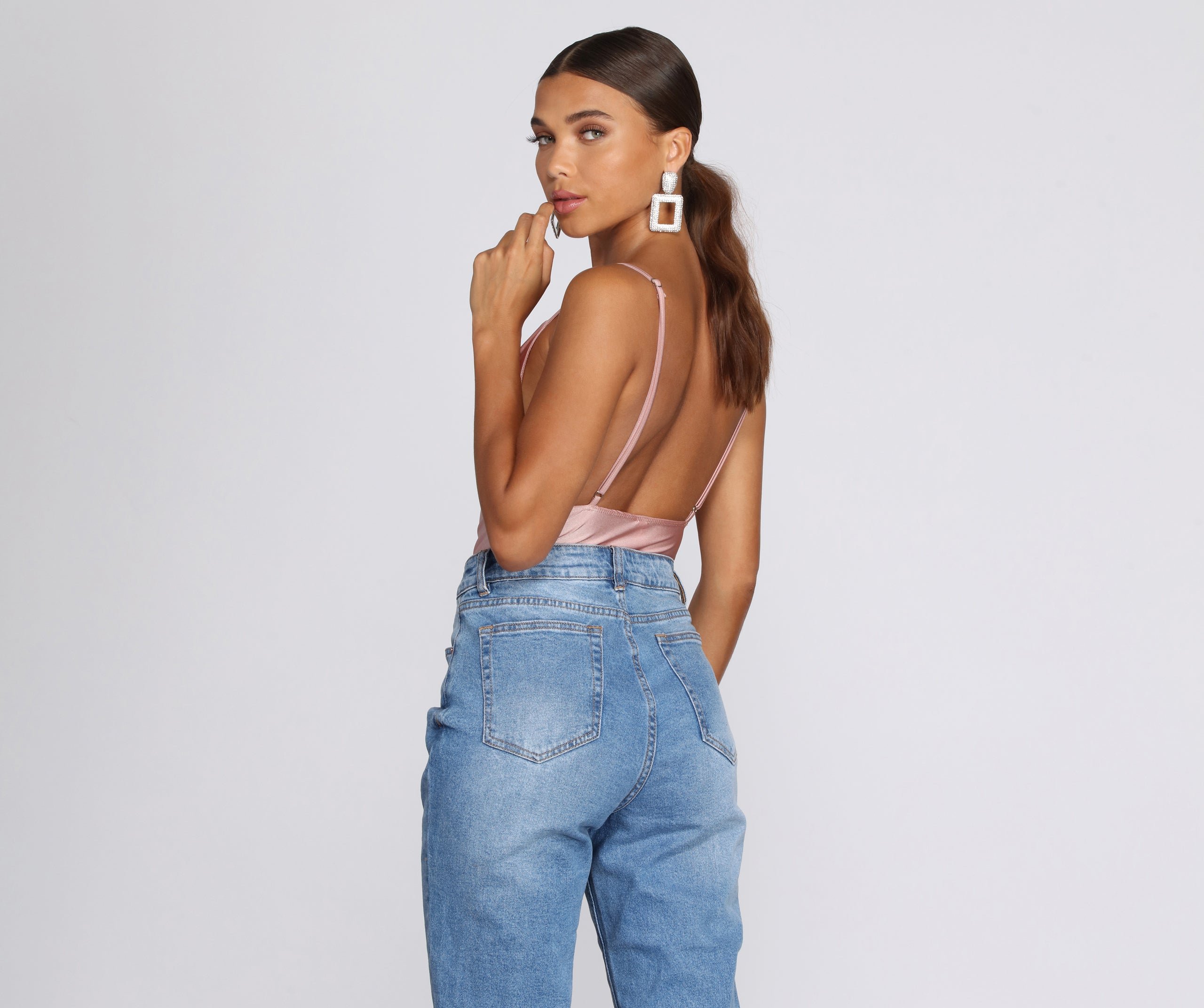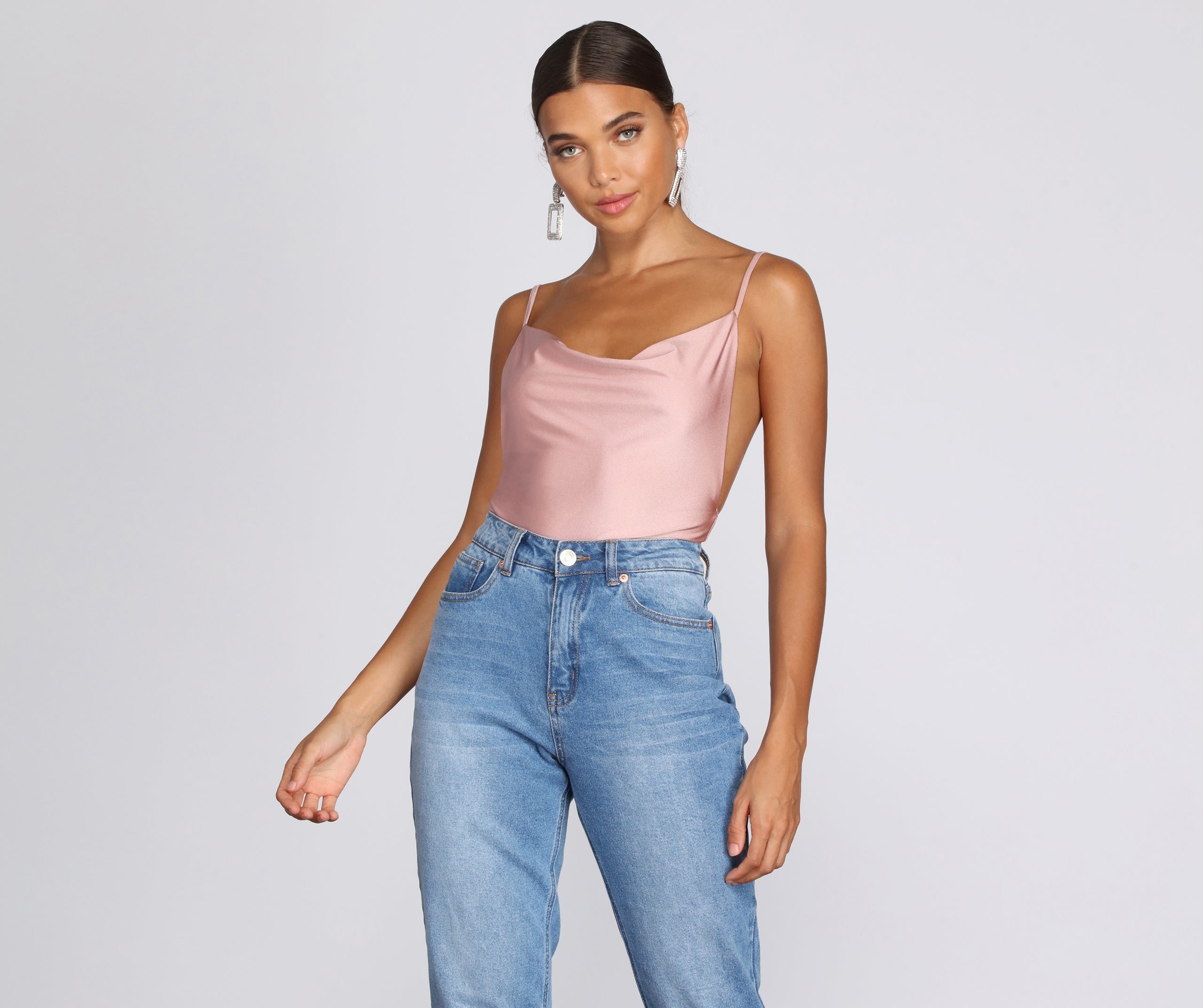 A flattering cowl neckline lends this bodysuit its instant appeal. Suit features adjustable spaghetti straps, an open back, a thong-style bottom, and double snap-button closure. Bodysuit is made from a shiny woven material with moderate stretch.