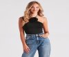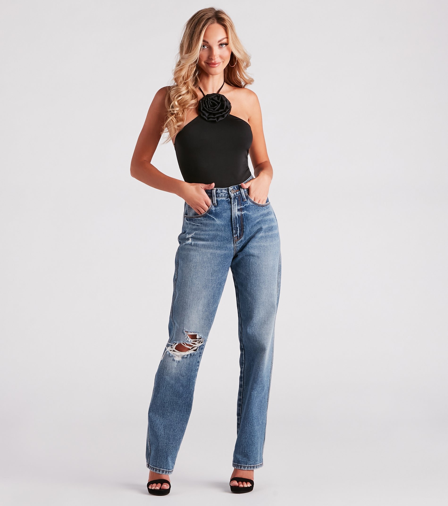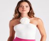 Create a pretty spring look with this sleeveless bodysuit featuring a halter neckline with tie-back closure, a statement rose on the front, a partially open back, and a form-hugging fit. Style with a sleek