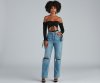 Kiss your new fave bodysuit hello! It features eye-catching Venetia ruche-styled long sleeves with tie, an off-the-shoulder neck, ruched bust with adjustable tie, a cutout bodice, and a dual snap closure on the thong cut bottom. Composed of a subtle sheen knit fabric with a moderate stretch. Style with cute boyfriend