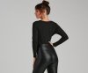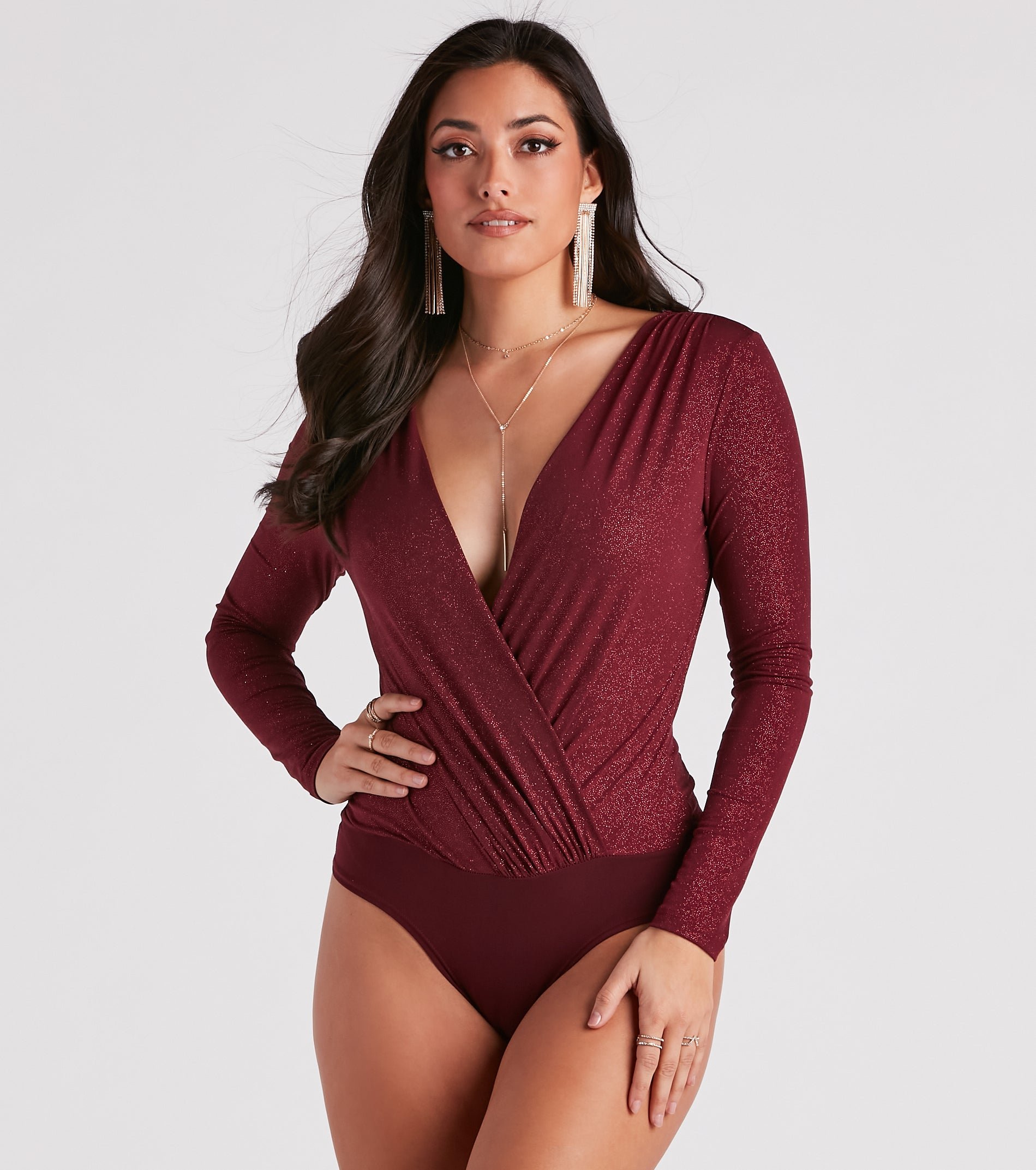 Showcase simple glam vibes in this glitter knit bodysuit that was made for a night out. It features a wrap-front design with a V-neckline, long fitted sleeves, a high waist seam, and a knit bottom. Style this shimmery bodysuit with