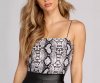 Stay oh so sassy in this snake printed bodysuit! It features a sleeveless bodice, bungee spaghetti straps, a square neckline and back, and a thong bottom with snap button closures. The bodysuit is composed of a knit fabric.