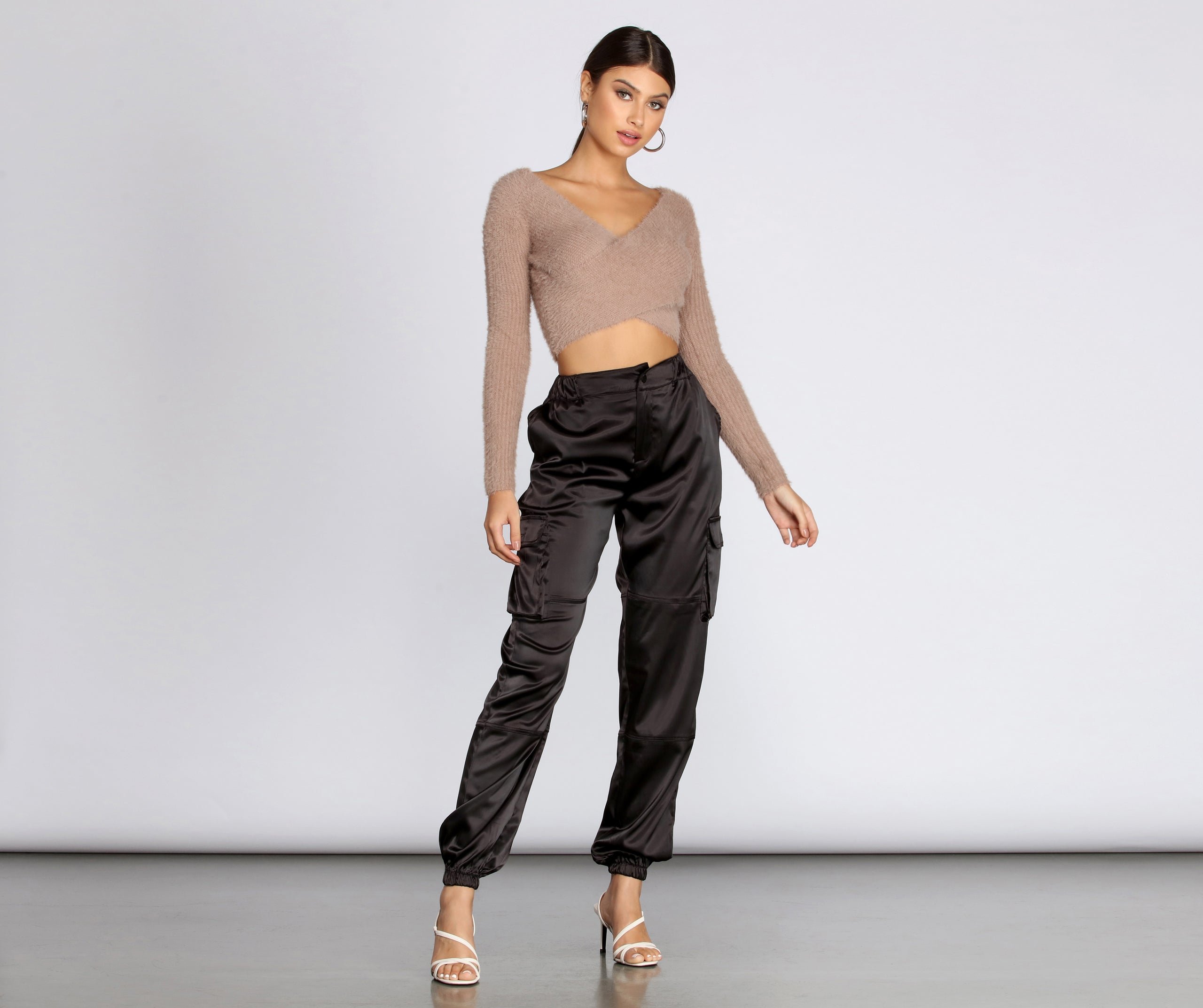 Your lashes will be on point in this eyelash knit crop! The top features long fitted sleeves, a wrap front creating a V neckline, and a cropped, form-fitting style. The fuzzy knit fabric offers moderate stretch.