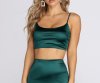 You fancy, huh? Don't miss out on this satiny cropped cami with stretch shoulder straps and an elasticized back. Piece is partially lined and made of a stretchy polyester blend that fits to your form. Complete the set with the matching mini skirt!