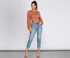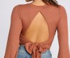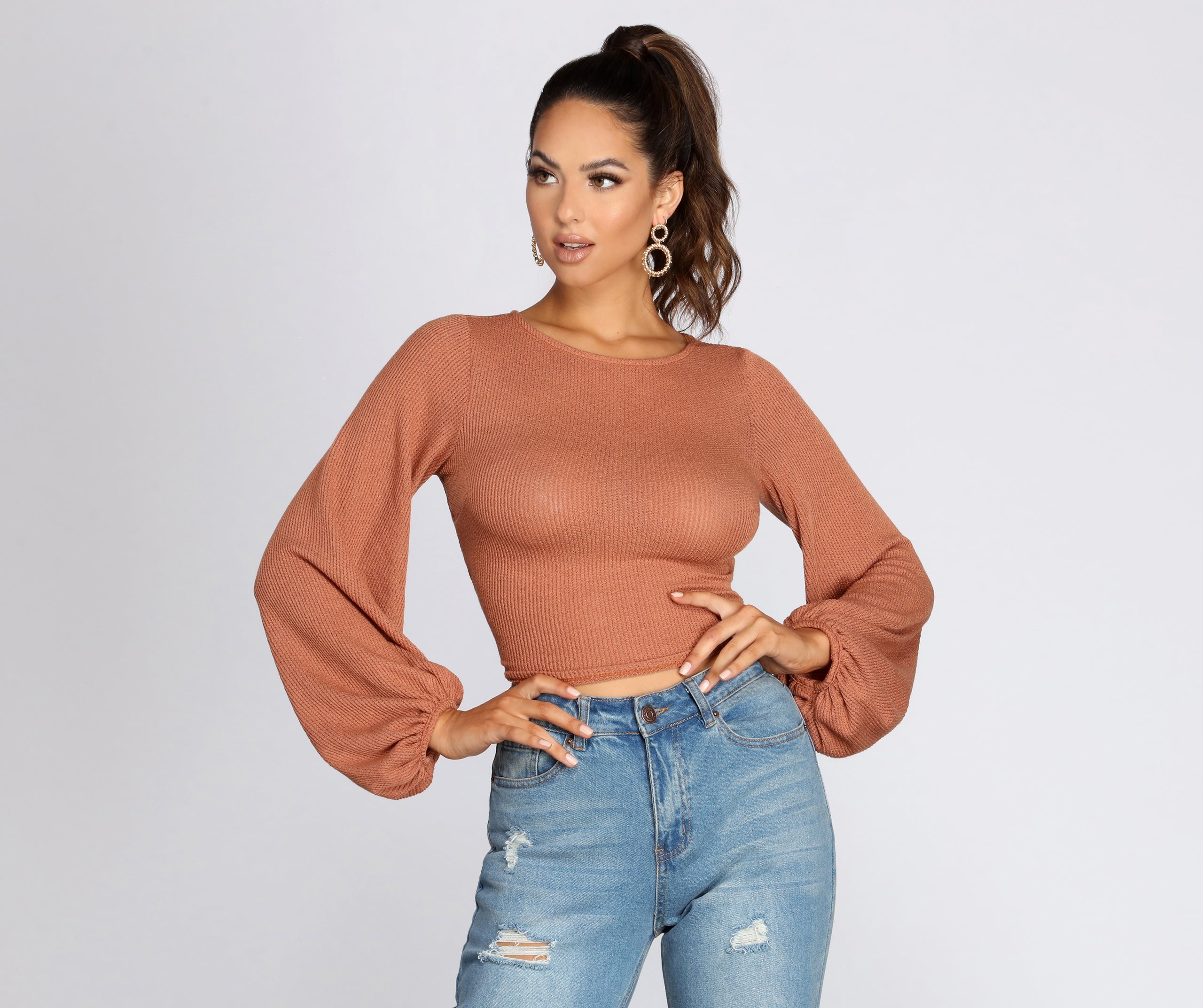 Soft and lightweight, this knit top is a must for fall. It features long bubble sleeves with elastic cuffs, a crew neckline, an open back with a lower tie detail, and a mid-length hem. The ribbed knit fabric offers plenty of stretch.