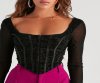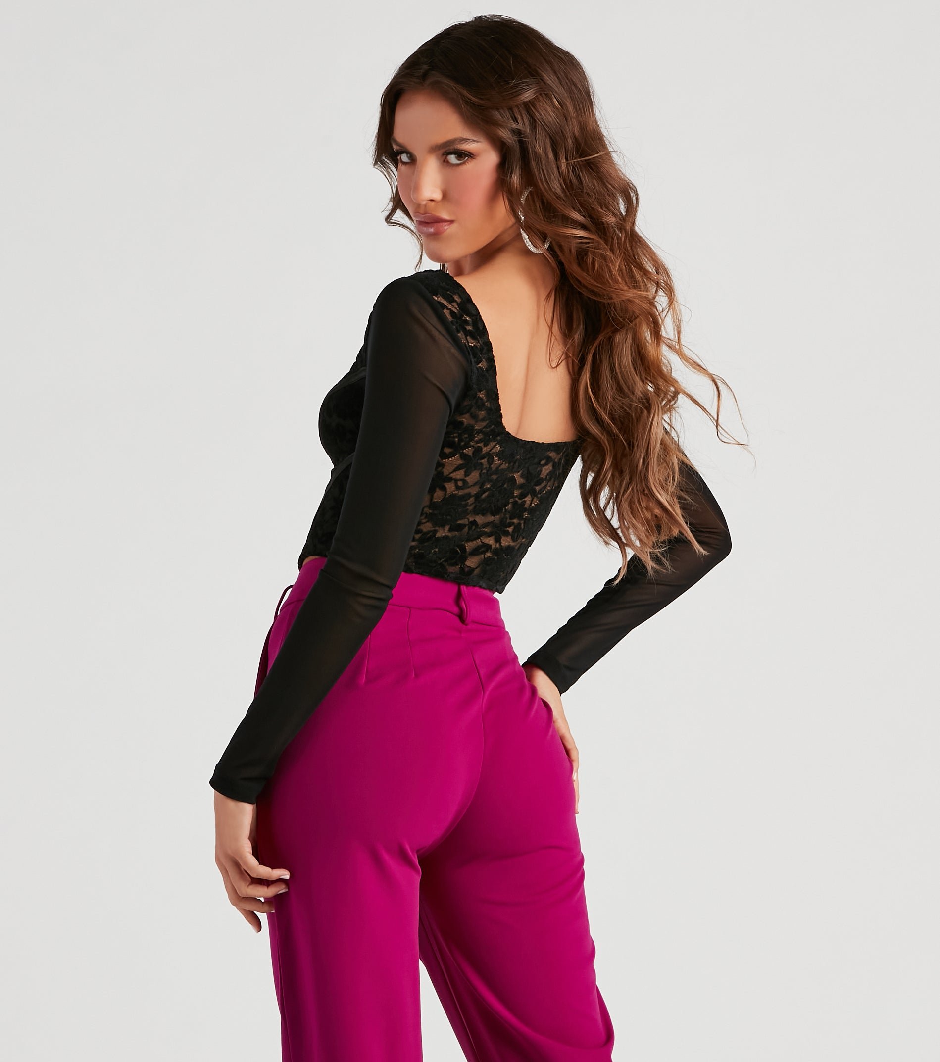 You'll be the majesty of chic-sultry style adorning this floral lace bustier featuring sheer long sleeves, a square neck, a sheer back, a pipe trim bodice with hook-eye closures, and a flocked velvet design. Complete the look with a slit