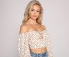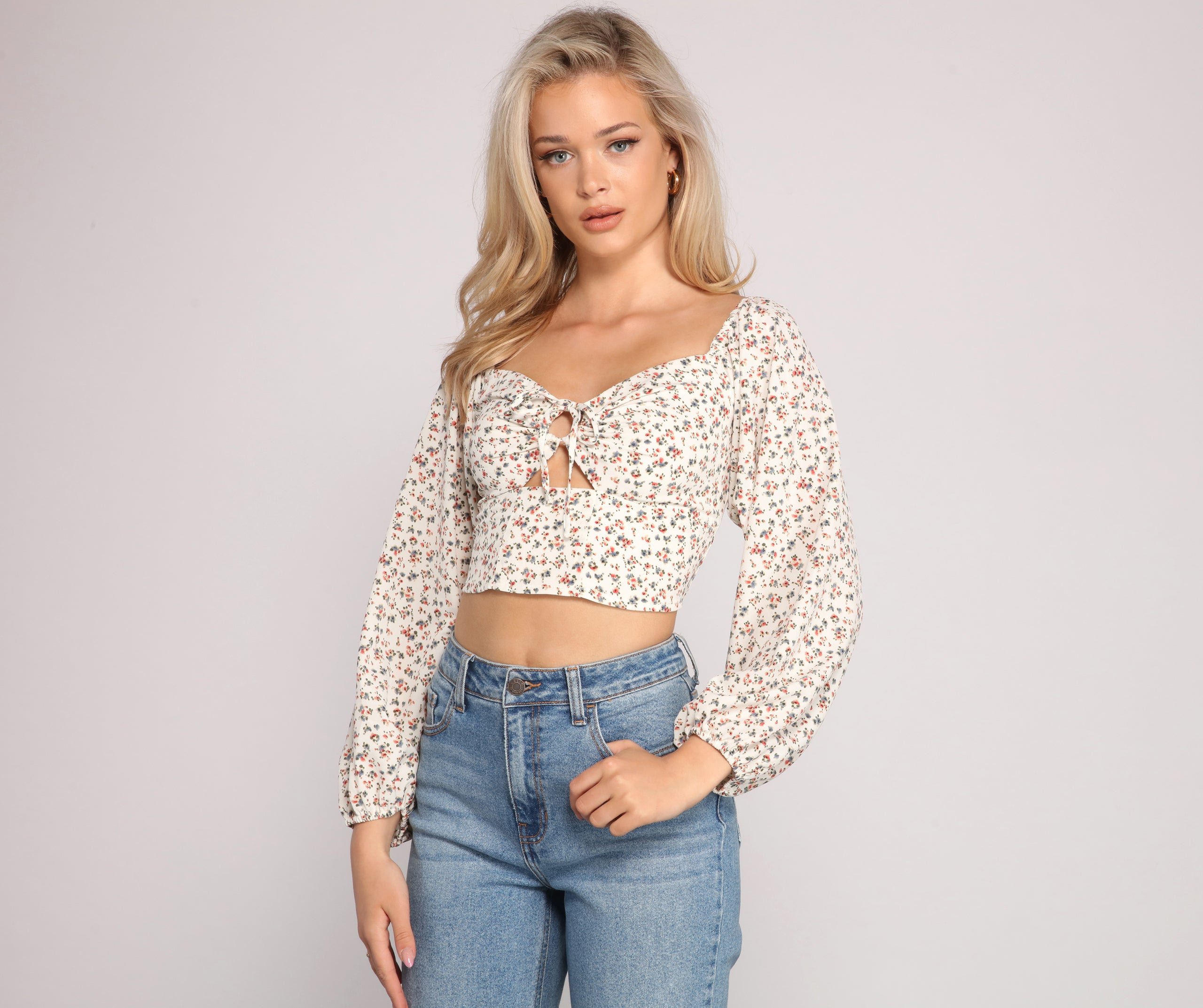 Cover yourself with a cute floral top that rings in stylish looks this season! The crop top features a floral print, an off-the-shoulder neckline, long sleeves, a double O-Ring design, and a cropped hem. Complete look with high-rise jeans.?