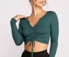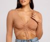 Get drawn in to this cute crop top! The top features a V-neckline with notched detail, a center drawstring, and a cropped hem. The top is composed of a ribbed knit fabric that offers a form hugging fit with a moderate stretch. Complete look with