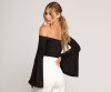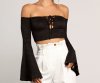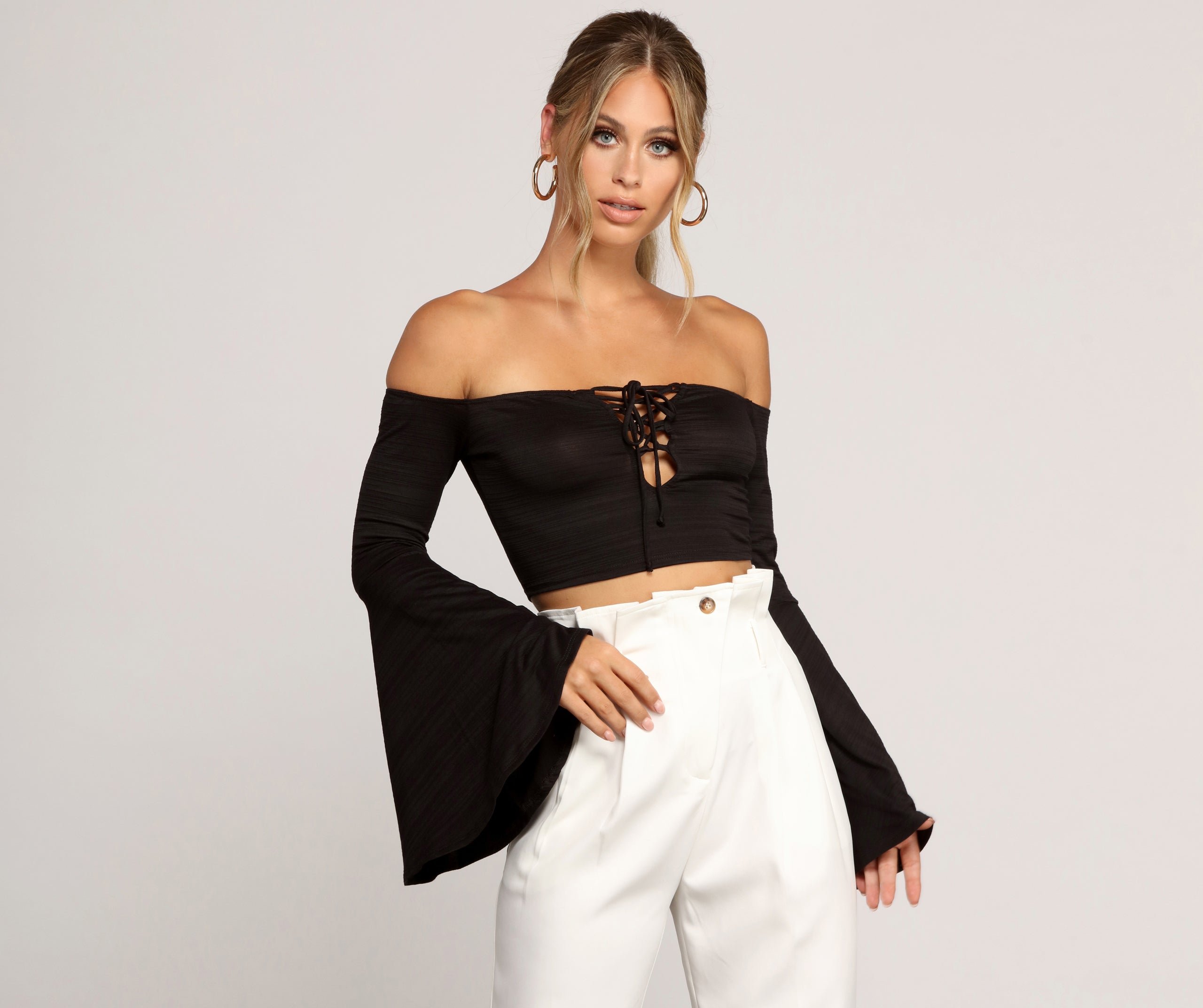 Flow with this adorable bell sleeve crop top! It features an off the shoulder square neckline, long bell sleeves with a flared hem, a lattice front detail, and a cropped hem. The top is composed of a lightweight knit fabric that offers moderate stretch.