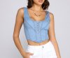 Channel a girl next door look with a corset that is perf for your next brunch! The top features a sleeveless square neckline, a hook and eye closure, a corset-bodice, and a cropped hem. The top is composed of a denim fabric that offers a relaxed fit. Complete look with