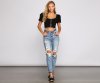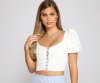 Get hooked to this chic top that showcases your stylish taste! The top features a sweetheart neckline, a hook and eye front closure, short puff sleeves, and a cropped hem. The top is composed of a ponte knit fabric that offers a form-hugging fit with a moderate stretch. Complete look with