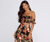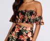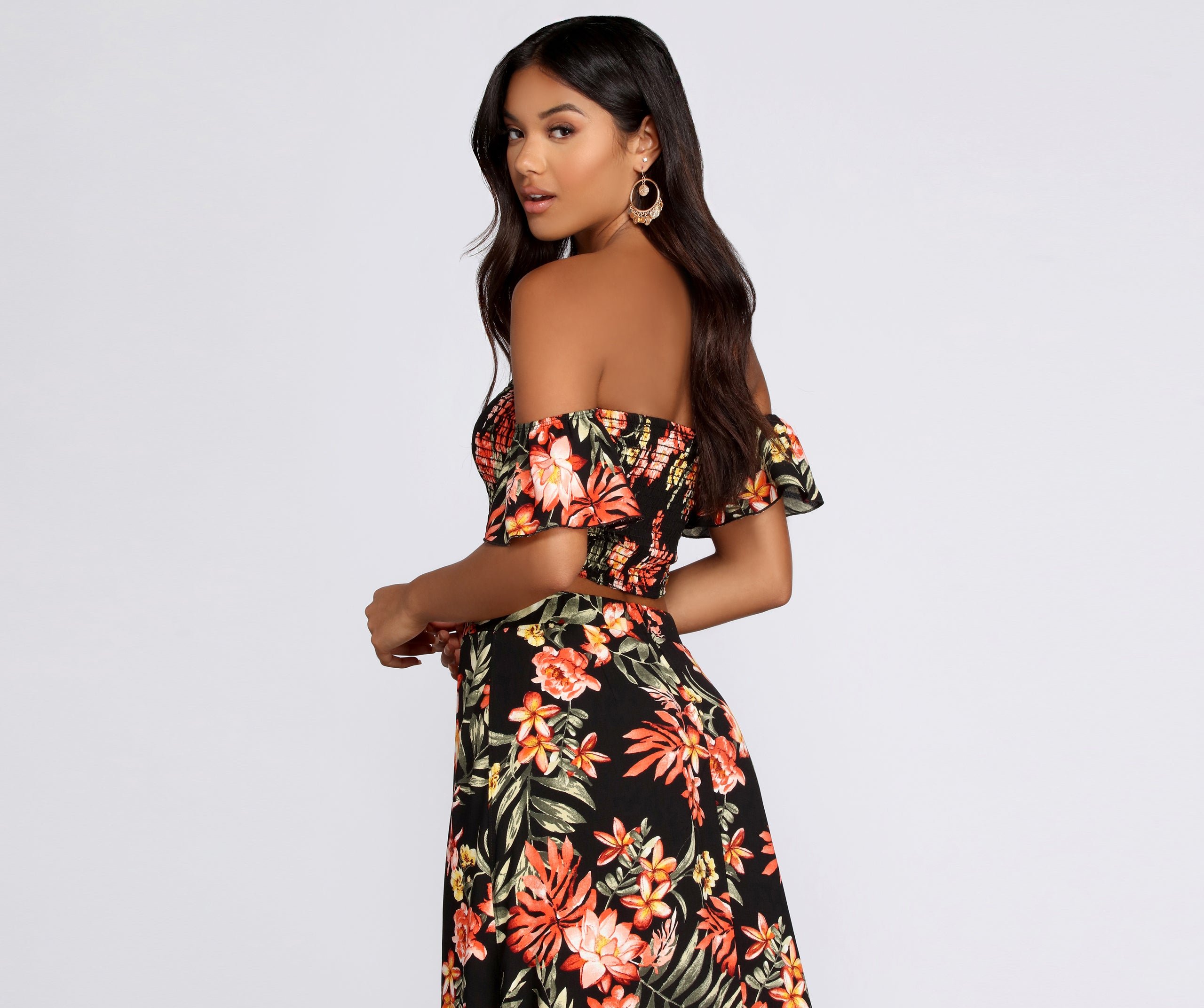 Keep the vacay vibes top of mind in this vibrant floral crop! Top features an off-the-shoulder neckline with ruffled short sleeves and a fully smocked bodice. Crop slips on and is made from a poly material with stretch through the bust. Don't forget to pair it with the matching side-slit skirt!