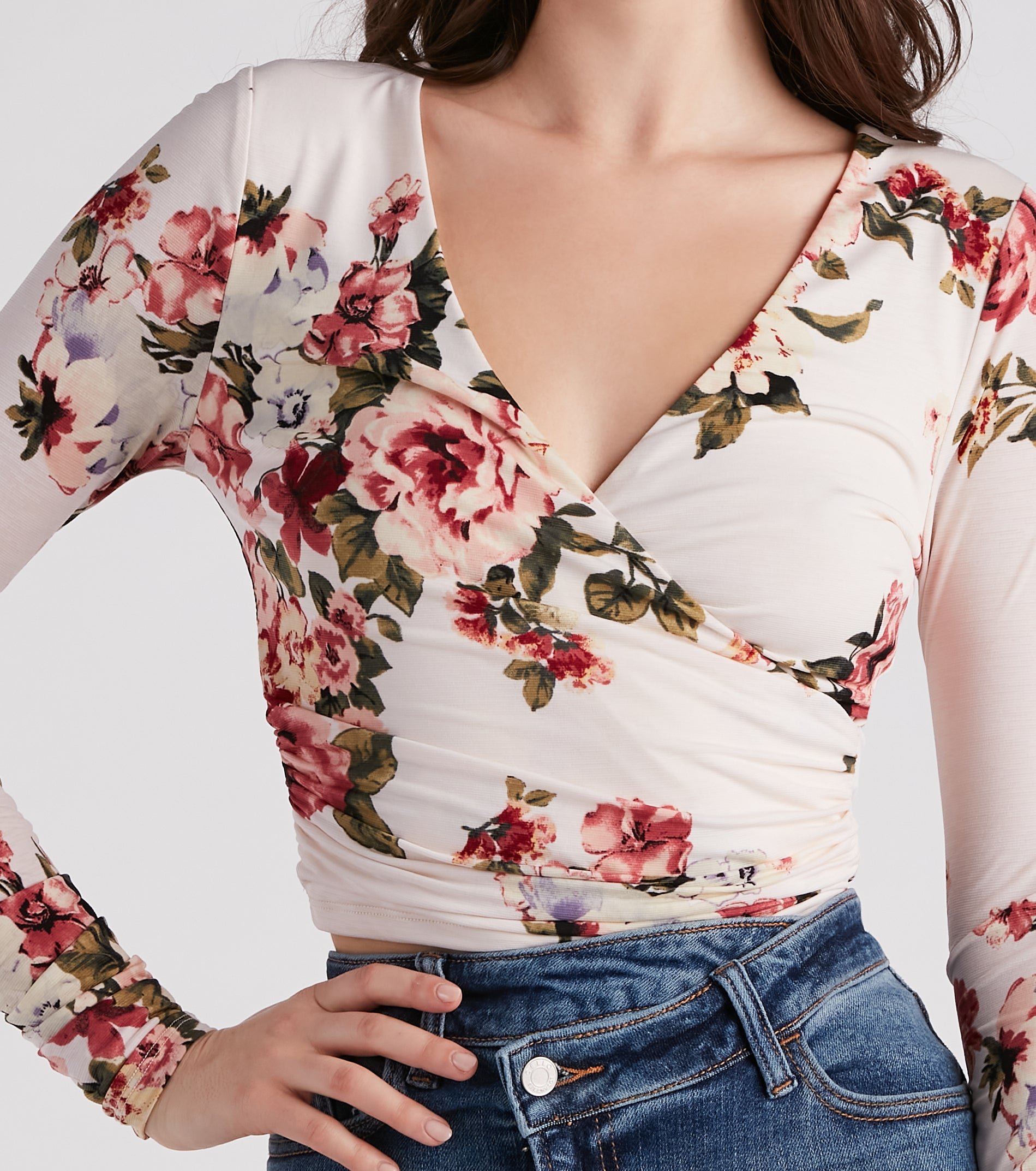 This floral crop top is in spring! It features fitted long sleeves, a V-neckline, a surplice bodice, and a fitted hem on stretchy knit fabric. The top has a gorgeous floral bloom print perfect for styling with