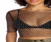 Don't miss out on this hot gem! The sheer top has a wide neckline paired with short sleeves and cropped fit. The garment is composed of a diamond pattern, mesh that features a colorful, heat stone detail throughout.