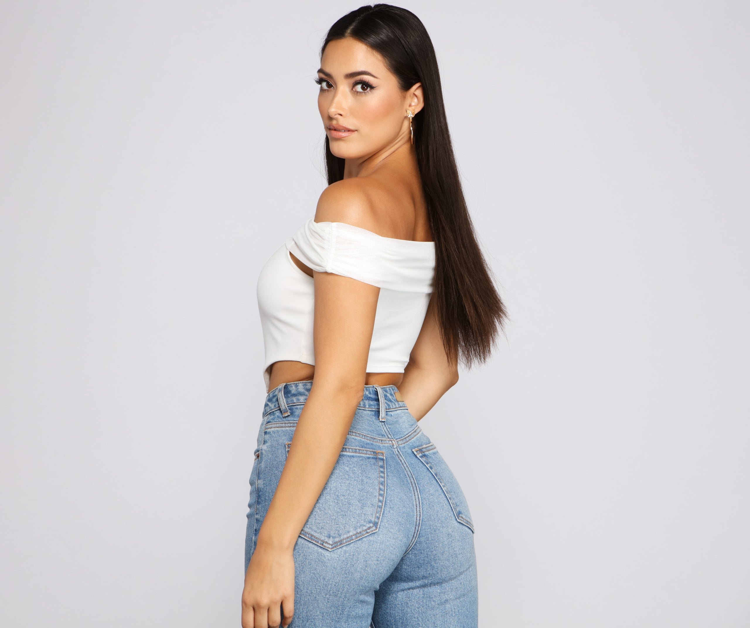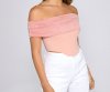 Create a picture-perfect moment with a gorge bustier! The bustier features an off-the-shoulder neckline, piping details, and a cropped hem. The bustier is composed of mesh and crepe. Complete look with
