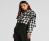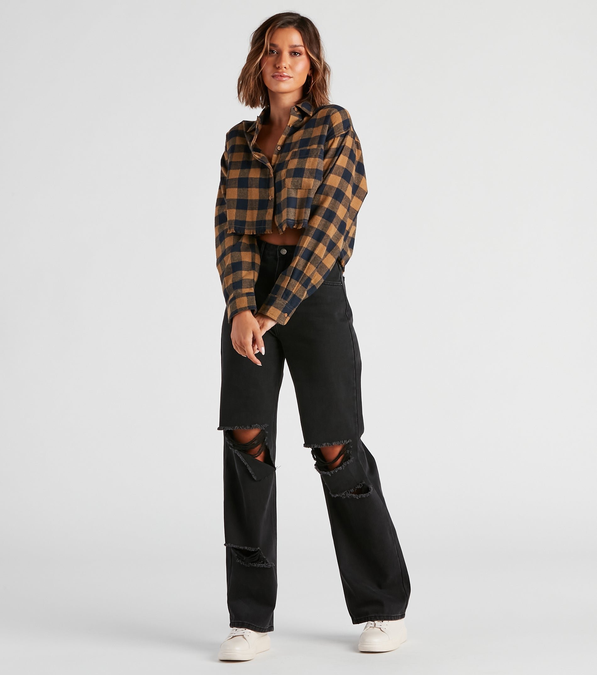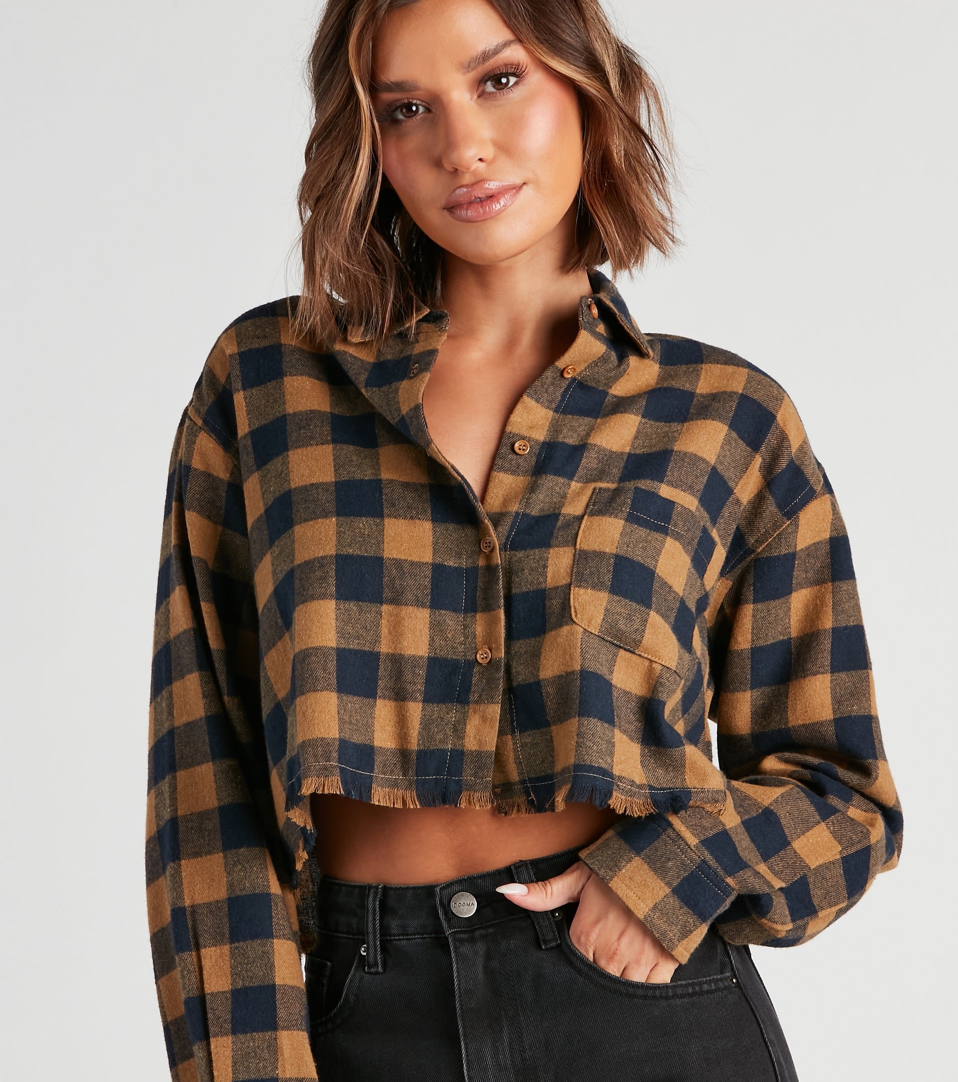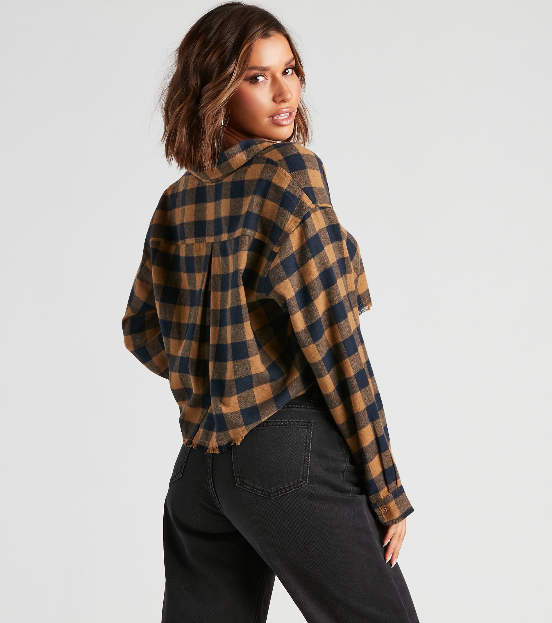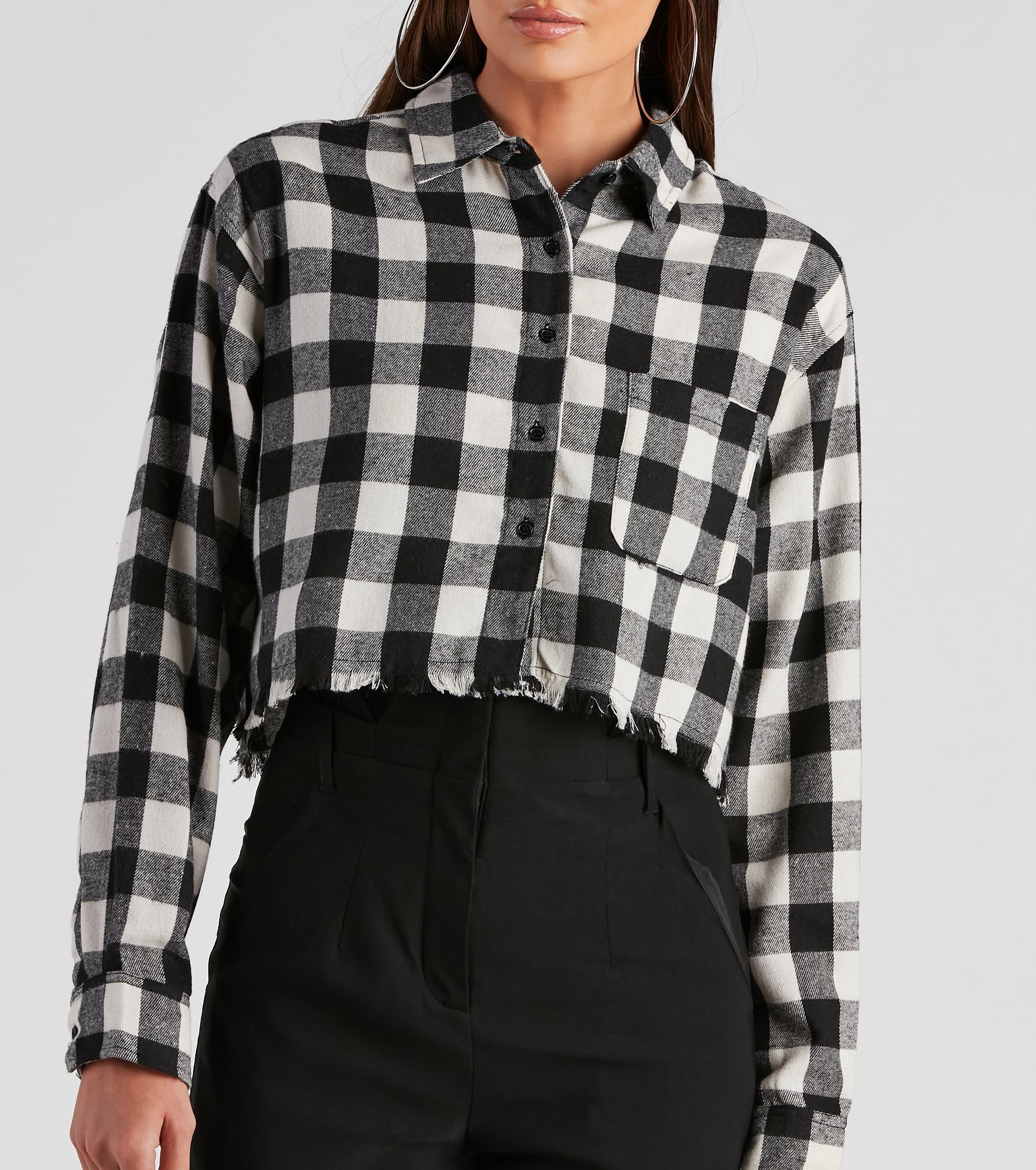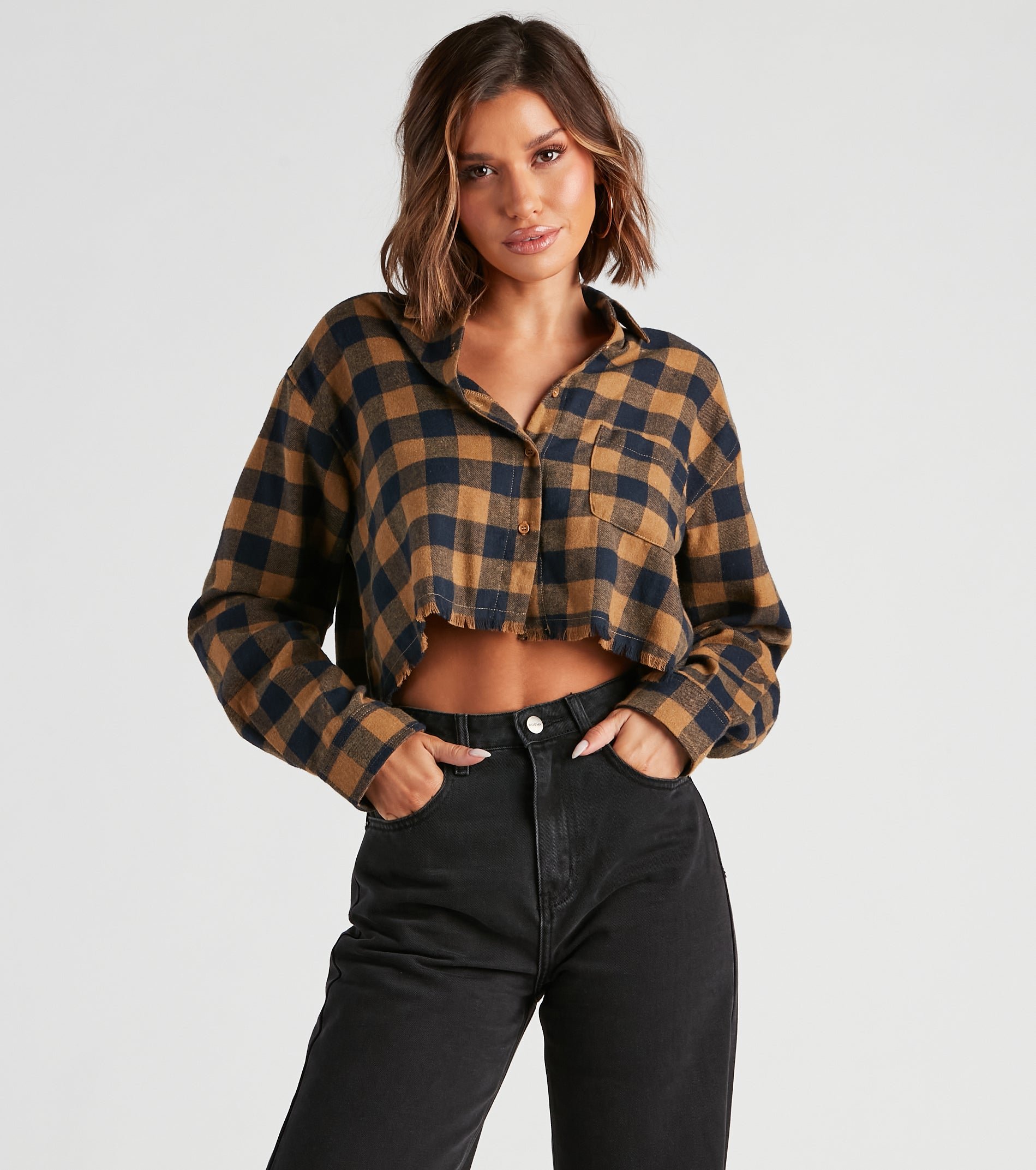 Throw on a cute plaid top to go with your PSL this season, babe! The top features a plaid print, a collared neckline, a button-down front, a large chest pocket, long sleeves, and a frayed cropped hem. The top is composed of a flannel knit fabric that offers a relaxed fit. Complete the look with high waist jeans and