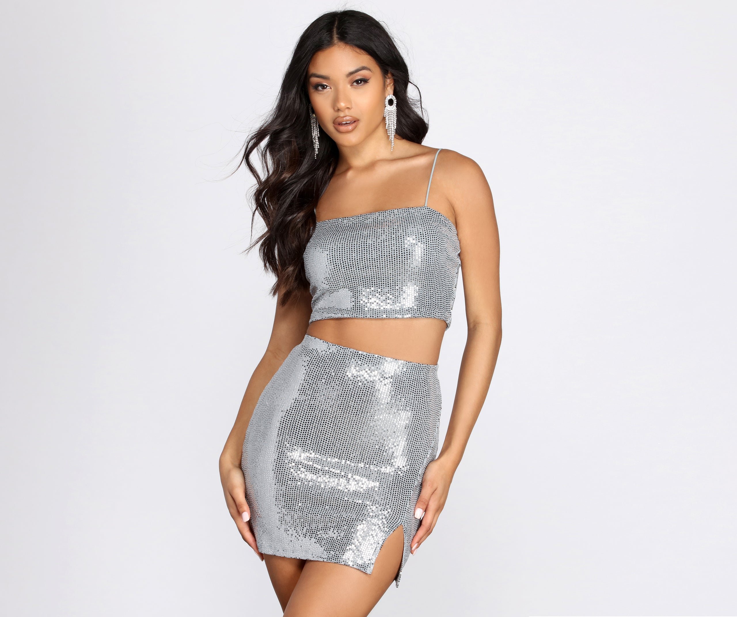 Stand out and be the star of your glam girl squad in this sequin cami top! Complete your look with the matching mini skirt.