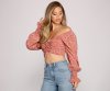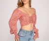 Radiate a gorge look with a floral crop top! The crop top features an off-the-shoulder neckline with a sweetheart bust, a triple-row tie front, long sleeves with smocked cuff, a ditsy floral print, and a cropped hem. The top is composed of a lightweight woven fabric that offers a relaxed fit with minimal stretch. Complete look with