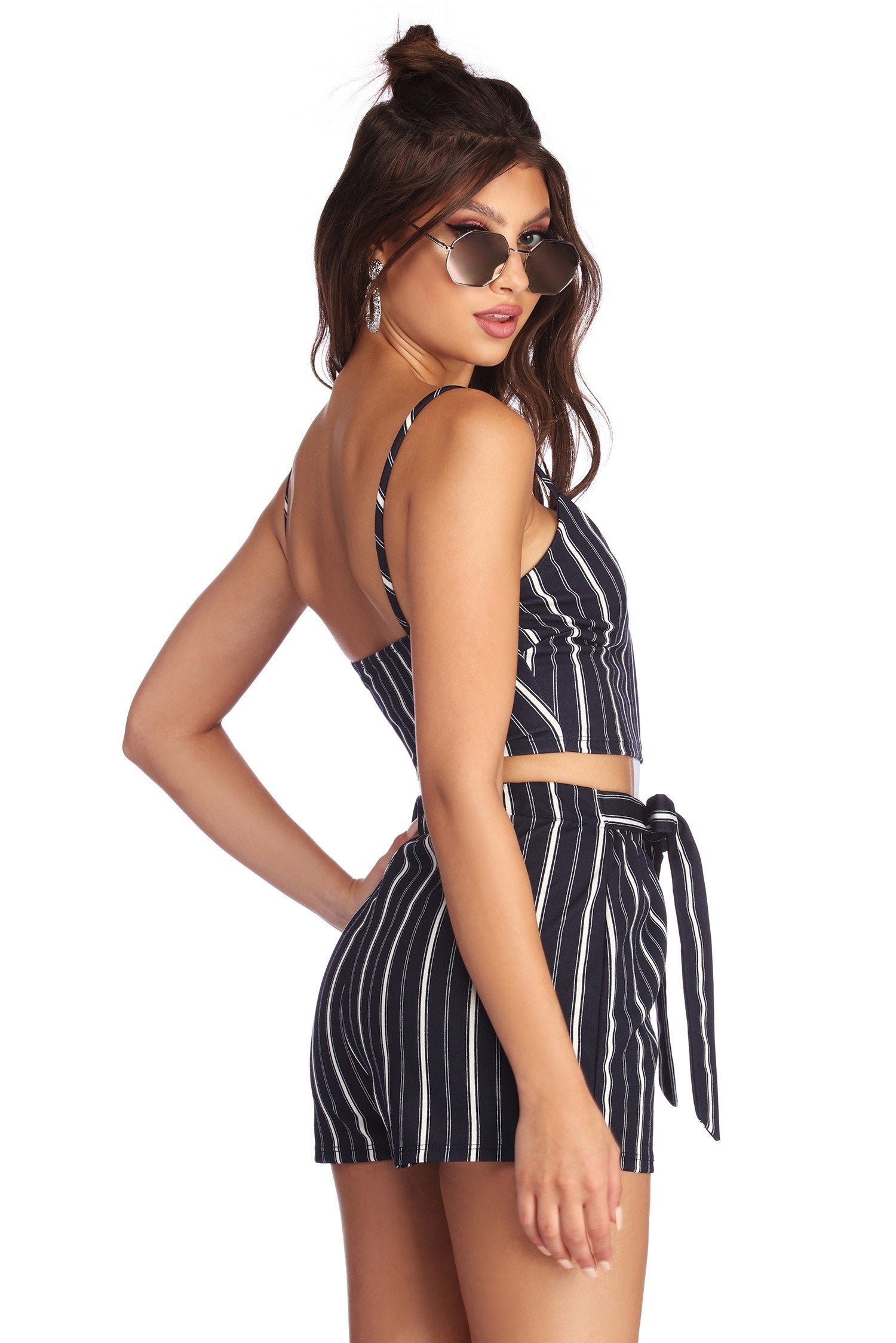 Stand out in trendy stripes in this cute black crop top! It features a sleeveless bodice, a V neckline, narrow shoulder straps and a cropped hem. The all over white contrasting stripes are complemented with a black background for a classic vibe! Be sure to pick up the matching shorts to complete your look!?